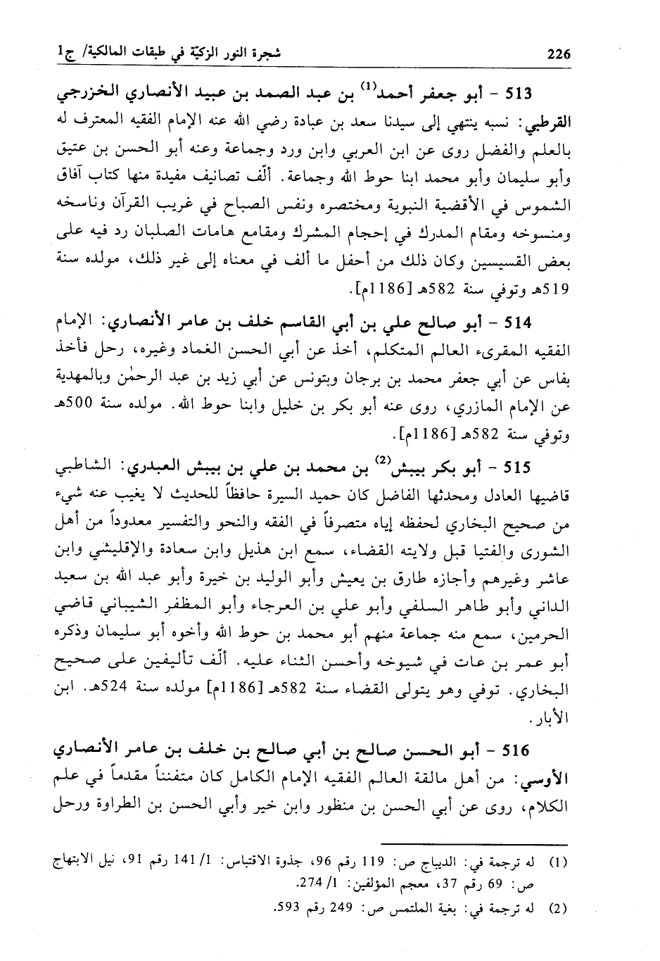 514 - أبو صالح علي بن أبي القاسم خلف بن عامر الأنصاري: الإِمام الفقيه المقرىء العالم المتكلم، أخذ عن أبي الحسن الغماد وغيره، رحل فأخذ بفاس عن أبي جعفر محمَّد بن برجان وبتونس عن أبي زيد بن عبد الرحمن وبالمهدية عن الإِمام المازري، روى عنه أبو بكر بن خليل وابنا حوط الله. مولده سنة 500 هـ وتوفي سنة 582 هـ[1186م].