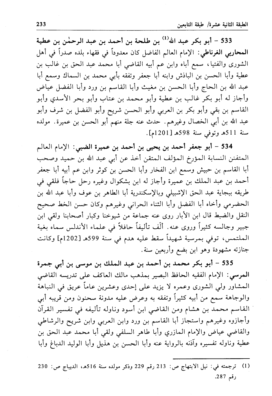 533 - أبو بكر عبد الله بن طلحة بن أحمد بن عبد الرحمن بن عطية المحاريي الغرناطي: الإِمام العالم الفاضل كان معدوداً في فقهاء بلده صدراً في أهل الشورى والفتيا، سمع أباه وابن عم أبيه القاضي أبا محمَّد عبد الحق بن غالب بن عطية وأبا الحسن بن الباذش وابنه أبا جعفر وتفقه بأبي محمَّد بن السماك وسمع أبا عبد الله بن الحاج وأبا الحسن بن مغيث وأبا القاسم بن ورد وأبا الفضل عياض وأجاز له أبو بكر غالب بن عطية وأبو محمد بن عتاب وأبو بحر الأسدي وأبو القاسم بن بقي وأبو بكر بن العربي وأبو الحسن شريح وأبو الفضل بن شرف وأبو عبد الله بن أبي الخصال وغيرهم. حدث عنه جلة منهم أبو الحسن بن عميرة. مولده سنة 511 هـ وتوفي سنة 598 هـ[1201 م]