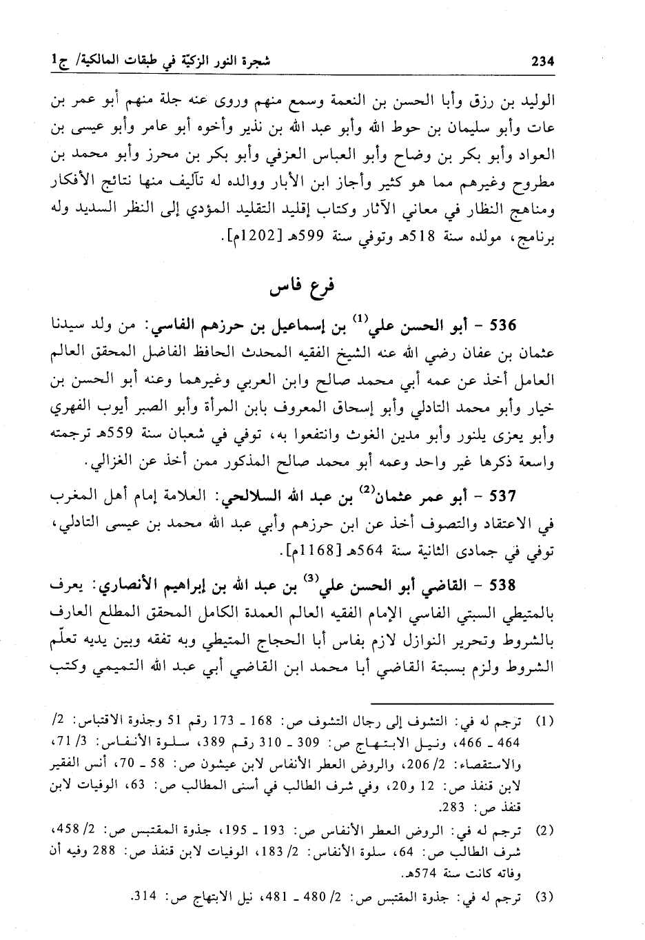 536 - أبو الحسن علي بن إسماعيل بن حرزهم الفاسي: من ولد سيدنا عثمان بن عفان رضي الله عنه الشيخ الفقيه المحدث الحافظ الفاضل المحقق العالم العامل أخذ عن عمه أبي محمَّد صالح وابن العربي وغيرهما وعنه أبو الحسن بن خيار وأبو محمَّد التادلي وأبو إسحاق المعروف بابن المرأة وأبو الصبر أيوب الفهري وأبو يعزى يلنور وأبو مدين الغوث وانتفعوا به، توفي في شعبان سنة 559 هـ ترجمته واسعة ذكرها غير واحد وعمه أبو محمَّد صالح المذكور ممن أخذ عن الغزالي.