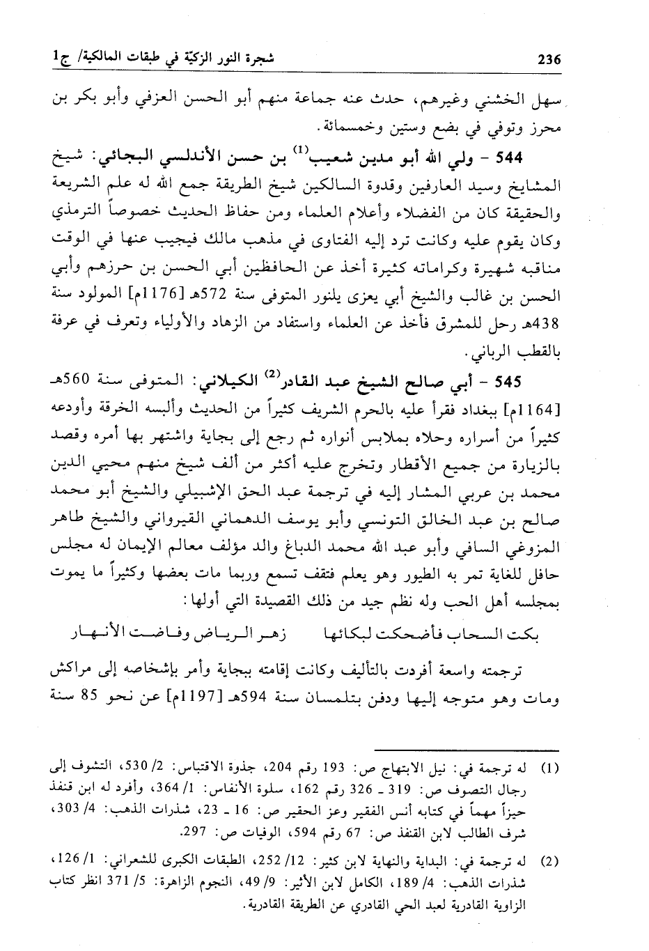 545 - أبي صالح الشيخ عبد القادر الكيلاني: المتوفى سنة 560 هـ[1164 م]، ببغداد فقرأ عليه بالحرم الشريف كثيراً من الحديث وألبسه الخرقة وأودعه كثيراً من أسراره وحلاه بملابس أنواره ثم رجع إلى بجاية واشتهر بها أمره وقصد بالزيارة من جميع الأقطار وتخرج عليه أكثر من ألف شيخ منهم محيي الدين محمَّد بن عربي المشار إليه في ترجمة عبد الحق الإشبيلي والشيخ أبو محمَّد صالح بن عبد الخالق التونسي وأبو يوسف الدهماني القيرواني والشيخ طاهر المزوغي السافي وأبو عبد الله محمَّد الدباغ والد مؤلف معالم الإيمان له مجلس حافل للغاية تمر به الطيور وهو يعلم فتقف تسمع وربما مات بعضها وكثيراً ما يموت بمجلسه أهل الحب وله نظم جيد من ذلك القصيدة التي أولها: