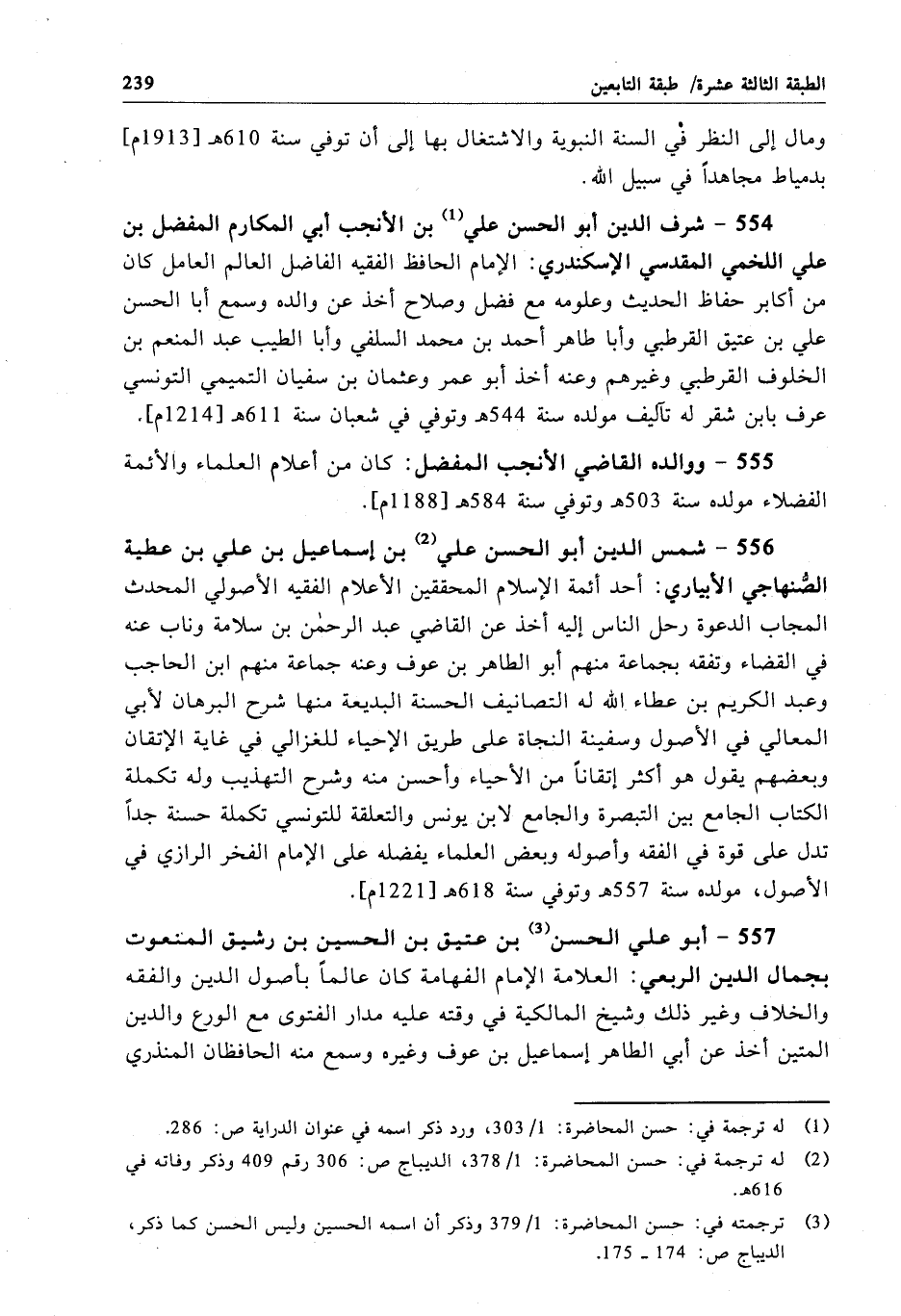 554 - شرف الدين أبو الحسن علي بن الأنجب أبي المكارم المفضل بن علي اللخمي المقدسي الإسكندري: الإِمام الحافظ الفقيه الفاضل العالم العامل كان من أكابر حفاظ الحديث وعلومه مع فضل وصلاح أخذ عن والده وسمع أبا الحسن علي بن عتيق القرطبي وأبا طاهر أحمد بن محمَّد السلفي وأبا الطيب عبد المنعم بن الخلوف القرطبي وغيرهم وعنه أخذ أبو عمر وعثمان بن سفيان التميمي التونسي عرف بابن شقر له تآليف مولده سنة 544 هـ وتوفي في شعبان سنة 611 هـ[1214م].