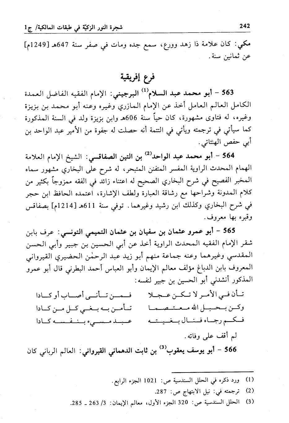 563 - أبو محمَّد عبد السلام البرجيني: الإِمام الفقيه الفاضل العمدة الكامل العالم العامل أخذ عن الإِمام المازري وغيره وعنه أبو محمَّد بن بزيزة وغيره، له فتاوى مشهورة، كان حياً سنة 606 هـ وابن بزيزة ولد في السنة المذكورة كما سيأتي في ترجمته ويأتي في التتمة أنه حصلت له جفوة من الأمير عبد الواحد بن أبي حفص الهنتاتى.