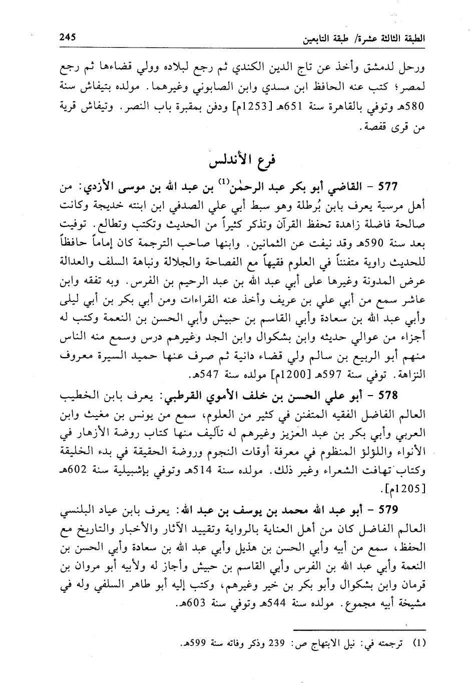 577 - القاضي أبو بكر عبد الرحمن بن عبد الله بن موسى الأزدي: من أهل مرسية يعرف بابن بُرطلة وهو سبط أبي علي الصدفي ابن ابنته خديجة وكانت صالحة فاضلة زاهدة تحفظ القرآن وتذكر كثيراً من الحديث وتكتب وتطالع. توفيت بعد سنة 590 هـ وقد نيفت عن الثمانين. وابنها صاحب الترجمة كان إماماً حافظاً للحديث راوية متفنناً في العلوم فقيهاً مع الفصاحة والجلالة ونباهة السلف والعدالة عرض المدونة وغيرها على أبي عبد الله بن عبد الرحيم بن الفرس. وبه تفقه وابن عاشر سمع من أبي علي بن عريف وأخذ عنه القراءات ومن أبي بكر بن أبي ليلى وأبي عبد الله بن سعادة وأبي القاسم بن حبيش وأبي الحسن بن النعمة وكتب له أجزاء من عوالي حديثه وابن بشكوال وابن الجد وغيرهم درس وسمع منه الناس منهم أبو الربيع بن سالم ولي قضاء دانية ثم صرف عنها حميد السيرة معروف النزاهة. توفي سنة 597 هـ[1200] م مولده سنة 547 هـ.