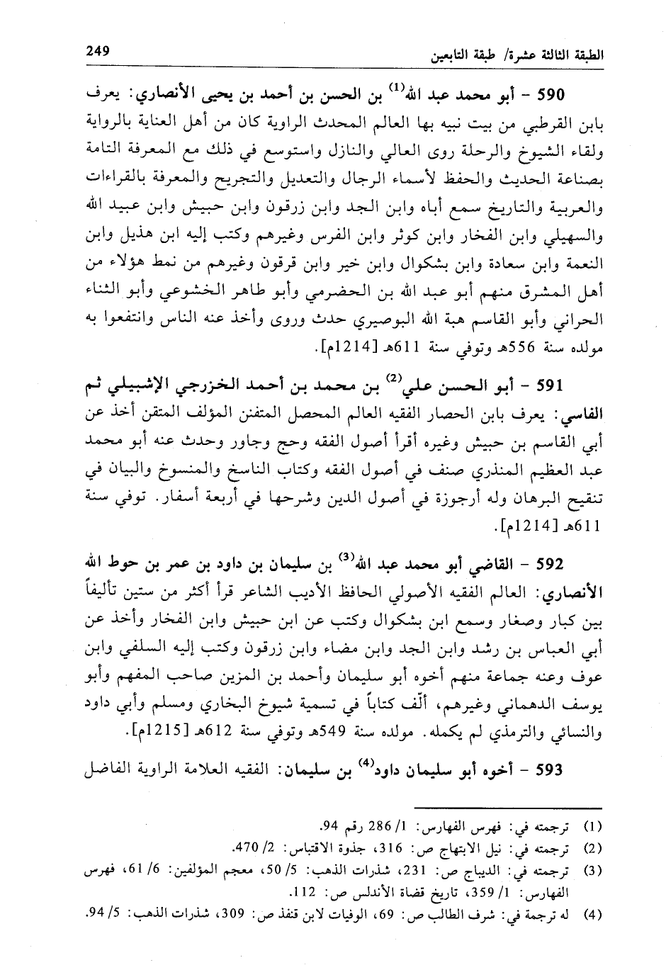 590 - أبو محمَّد عبد الله بن الحسن بن أحمد بن يحيي الأنصاري: يعرف بابن القرطبي من بيت نبيه بها العالم المحدث الراوية كان من أهل العناية بالرواية ولقاء الشيوخ والرحلة روى العالي والنازل واستوسع في ذلك مع المعرفة التامة بصناعة الحديث والحفظ لأسماء الرجال والتعديل والتجريح والمعرفة بالقراءات والعربية والتاريخ سمع أباه وابن الجد وابن زرقون وابن حبيش وابن عبيد الله والسهيلي وابن الفخار وابن كوثر وابن الفرس وغيرهم وكتب إليه ابن هذيل وابن النعمة وابن سعادة وابن بشكوال وابن خير وابن قرقون وغيرهم من نمط هؤلاء من أهل المشرق منهم أبو عبد الله بن الحضرمي وأبو طاهر الخشوعي وأبو الثناء الحراني وأبو القاسم هبة الله البوصيري حدث وروى وأخذ عنه الناس وانتفعوا به مولده سنة 556 هـ وتوفي سنة 611 هـ[1214م].