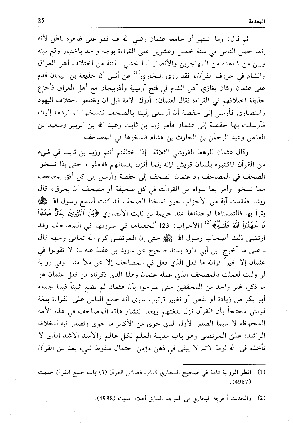 وقال عثمان للرهط القريشي الثلاثة: إذا اختلفتم أنتم وزيد بن ثابت في شيء من القرآن فاكتبوه بلسان قريش فإنه إنما أنزل بلسانهم ففعلوا، حتى إذا نسخوا الصحف في المصاحف رد عثمان الصحف إلى حفصة وأرسل إلى كل أفق بمصحف مما نسخوا وأمر بما سواه من القراآت في كل صحيفة أو مصحف أن يحرق، قال زيد: ففقدت آية من الأحزاب حين نسخنا الصحف قد كنت أسمع رسول الله - صلى الله عليه وسلم - يقرأ بها فالتمسناها فوجدناها عند خزيمة بن ثابت الأنصاري {مِنَ الْمُؤْمِنِينَ رِجَالٌ صَدَقُوا مَا عَاهَدُوا اللَّهَ عَلَيْهِ} [الأحزاب: 23] ألحقناها في سورتها في المصحف وقد ارتضى ذلك أصحاب رسول الله - صلى الله عليه وسلم - حتى إن المرتضى كرم الله تعالى وجهه قال - على ما أخرج ابن أبي داود بسند صحيح عن سويد بن غفلة عنه -: لا تقولوا في عثمان إلا خيراً فوالله ما فعل الذي فعل في المصاحف إلا عن ملأ منا. وفي رواية لو وليت لعملت بالمصحف الذي عمله عثمان وهذا الذي ذكرناه من فعل عثمان هو ما ذكره غير واحد من المحققين حتى صرحوا بأن عثمان لم يضع شيئاً فيما جمعه أبو بكر من زيادة أو نقص أو تغيير ترتيب سوى أنه جمع الناس على القراءة بلغة قريش محتجاً بأن القرآن نزل بلغتهم وبعد انتشار هاته المصاحف في هذه الأمة المحفوظة لا سيما الصدر الأول الذي حوى من الأكابر ما حوى وتصدر فيه للخلافة الراشدة عليّ المرتضى وهو باب مدينة العلم لكل عالم والأسد الأشد الذي لا تأخذه في الله لومة لائم لا يبقى في ذهن مؤمن احتمال سقوط شيء يعد من القرآن