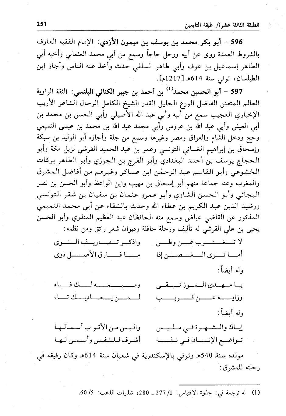 597 - أبو الحسين محمَّد بن أحمد بن جبير الكناني البلنسي: الثقة الراوية العالم المتفنن الفاضل الورع الجليل القدر الشيخ الكامل الرحال الشاعر الأريب الإخباري العجيب سمع من أبيه وأبي عبد الله الأصيلي وأبي الحسن بن محمَّد بن أبي العيش وأبي عبد الله بن عروس وأبي محمَّد عبد الله بن محمَّد بن عيسى التميمي وحج ودخل الشام والعراق ومصر وغيرها وسمع من جلة وأجازه أبو الوليد بن سبكة وإسحاق بن إبراهيم الغساني التونسي وعمر بن عبد الحميد القرشي نزيل مكة وأبو الحجاج يوسف بن أحمد البغدادي وأبو الفرج بن الجوزي وأبو الطاهر بركات الخشوعي وأبو القاسم عبد الرحمن ابن عساكر وغيرهم من أفاضل المشرق والمغرب وعنه جماعة منهم أبو إسحاق بن مهيب وابن الواعظ وأبو الحسن بن نصر البجائي وأبو الحسن الشاوي وأبو عمرو عثمان بن سفيان بن شقر التونسي ورشيد الدين عبد الكريم بن عطاء الله وحدث بالشفاء عن أبي محمَّد التميمي المذكور عن القاضي عياض وسمع منه الحافظان عبد العظيم المنذري وأبو الحسن يحيى بن علي القرشي له تأليف ورحلة حافلة وديوان شعر رائق ومن نظمه: