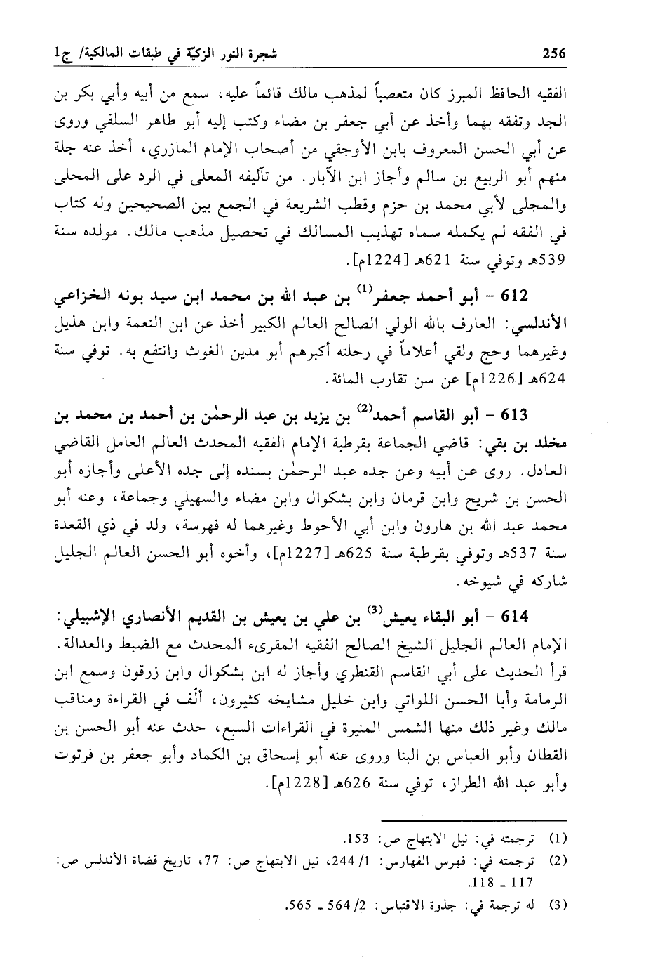 613 - أبو القاسم أحمد بن يزيد بن عبد الرحمن بن أحمد بن محمد بن مخلد بن بقي: قاضي الجماعة بقرطبة الإِمام الفقيه المحدث العالم العامل القاضي العادل. روى عن أبيه وعن جده عبد الرحمن بسنده إلى جده الأعلى وأجازه أبو الحسن بن شريح وابن قرمان وابن بشكوال وابن مضاء والسهيلي وجماعة، وعنه أبو محمد عبد الله بن هارون وابن أبي الأحوط وغيرهما له فهرسة، ولد في ذي القعدة سنة 537 هـ وتوفي بقرطبة سنة 625 هـ[1227 م]، وأخوه أبو الحسن العالم الجليل شاركه في شيوخه.