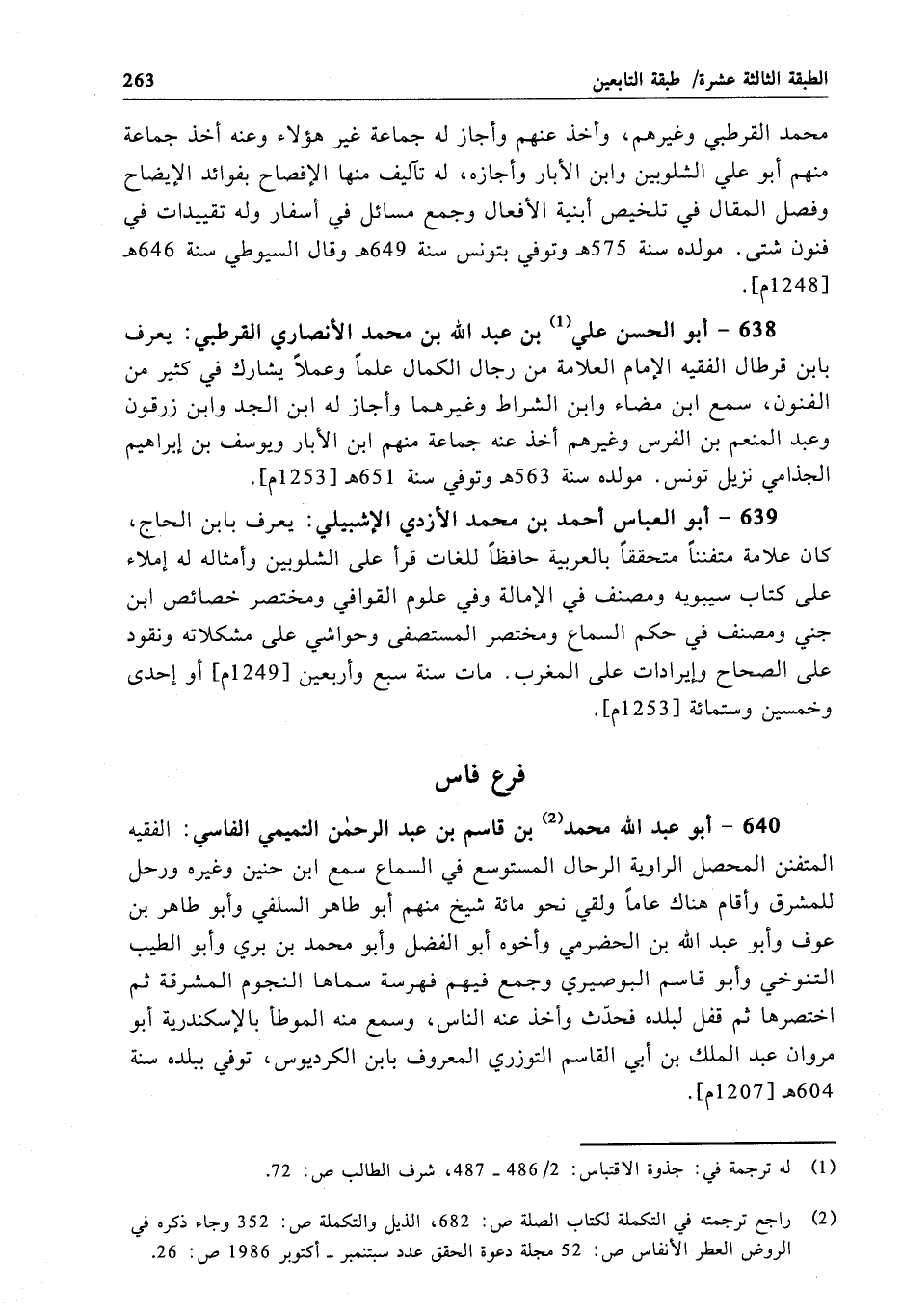 640 - أبو عبد الله محمد بن قاسم بن عبد الرحمن التميمي الفاسي: الفقيه المتفنن المحصل الراوية الرحال المستوسع في السماع سمع ابن حنين وغيره ورحل للمشرق وأقام هناك عاماً ولقي نحو مائة شيخ منهم أبو طاهر السلفي وأبو طاهر بن عوف وأبو عبد الله بن الحضرمي وأخوه أبو الفضل وأبو محمد بن بري وأبو الطيب التنوخي وأبو قاسم البوصيري وجمع فيهم فهرسة سماها النجوم المشرقة ثم اختصرها ثم قفل لبلده فحدّث وأخذ عنه الناس، وسمع منه الموطأ بالإسكندرية أبو مروان عبد الملك بن أبي القاسم التوزري المعروف بابن الكرديوس، توفي بيلده سنة 604 هـ[1207م].