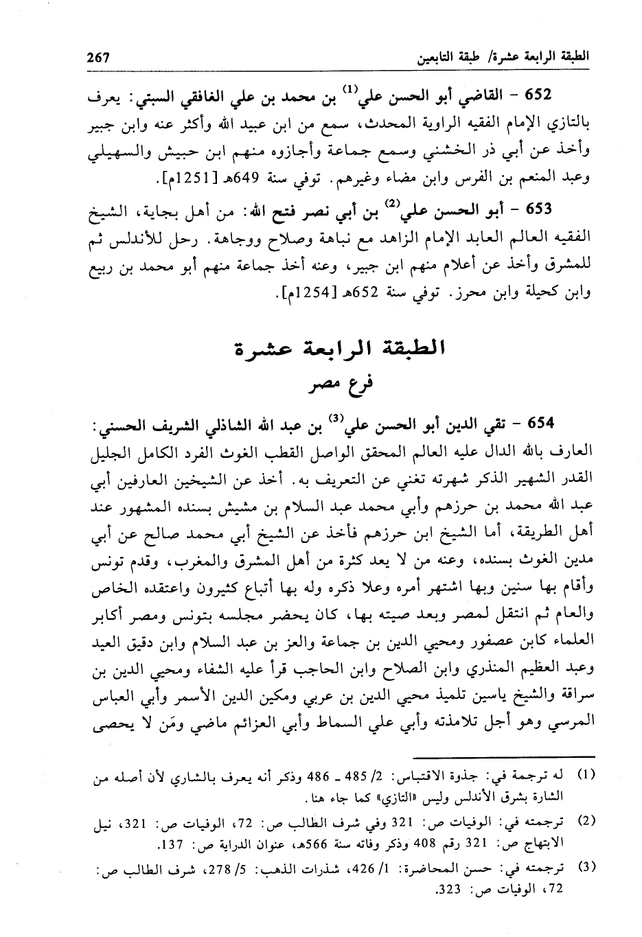 654 - تقي الدين أبو الحسن علي بن عبد الله الشاذلي الشريف الحسني: العارف بالله الدال عليه العالم المحقق الواصل القطب الغوث الفرد الكامل الجليل القدر الشهير الذكر شهرته تغني عن التعريف به. أخذ عن الشيخين العارفين أبي عبد الله محمد بن حرزهم وأبي محمد عبد السلام بن مشيش بسنده المشهور عند أهل الطريقة، أما الشيخ ابن حرزهم فأخذ عن الشيخ أبي محمد صالح عن أبي مدين الغوث بسنده، وعنه من لا يعد كثرة من أهل المشرق والمغرب، وقدم تونس وأقام بها سنين وبها اشتهر أمره وعلا ذكره وله بها أتباع كثيرون واعتقده الخاص والعام ثم انتقل لمصر وبعد صيته بها، كان يحضر مجلسه بتونس ومصر أكابر العلماء كابن عصفور ومحيي الدين بن جماعة والعز بن عبد السلام وابن دقيق العيد وعبد العظيم المنذري وابن الصلاح وابن الحاجب قرأ عليه الشفاء ومحيي الدين بن سراقة والشيخ ياسين تلميذ محيي الدين بن عربي ومكين الدين الأسمر وأبي العباس المرسي وهو أجل تلامذته وأبي علي السماط وأبي العزائم ماضي ومَن لا يحصى