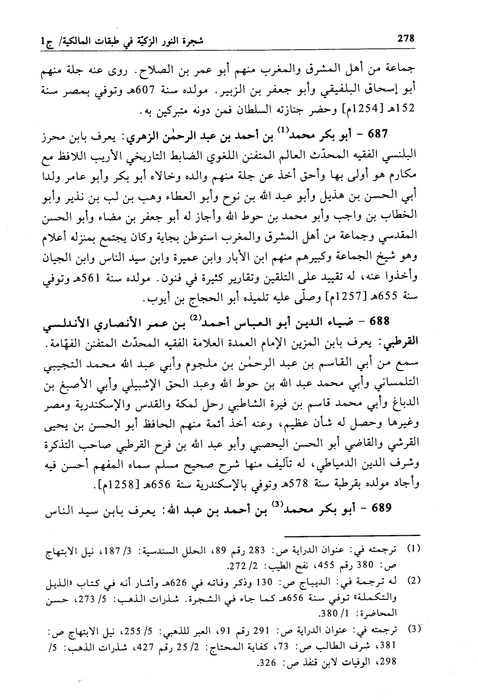 688 - ضياء الدين أبو العباس أحمد بن عمر الأنصاري الأندلسي القرطبي: يعرف بابن المزين الإِمام العمدة العلامة الفقيه المحدّث المتفنن الفهّامة. سمع من أبي القاسم بن عبد الرحمن بن ملجوم وأبي عبد الله محمد التجيبي التلمساني وأبي محمد عبد الله بن حوط الله وعبد الحق الإشبيلي وأبي الأصبغ بن الدباغ وأبي محمد قاسم بن فيرة الشاطبي رحل لمكة والقدس والإسكندرية ومصر وغيرها وحصل له شأن عظيم، وعنه أخذ أئمة منهم الحافظ أبو الحسن بن يحيى القرشي والقاضي أبو الحسن اليحصبي وأبو عبد الله بن فرح القرطبي صاحب التذكرة وشرف الدين الدمياطي، له تآليف منها شرح صحيح مسلم سماه المفهم أحسن فيه وأجاد مولده بقرطبة سنة 578 هـ وتوفي بالإسكندرية سنة 656 هـ[1258 م].