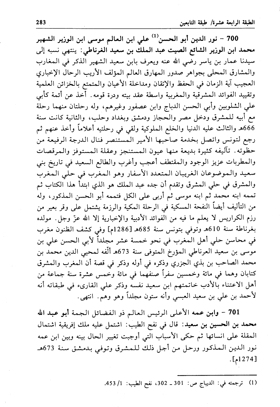 700 - نور الدين أبو الحسن علي ابن العالم موسى ابن الوزير الشهير محمد ابن الوزير الشائع الصيت عبد الملك بن سعيد الغرناطي: ينتهي نسبه إلى سيدنا عمار بن ياسر رضي الله عنه ويعرف بابن سعيد الشهير الذكر في المغارب والمشارق المحلى بجواهر صدور المهارق العالم المؤلف الأريب الرحال الإخباري العجيب آية الزمان في الحفظ والإتقان ومداخلة الأعيان والمتمتع بالخزائن العلمية وتقييد الفوائد المشرقية والمغربية واسطة عقد بيته ودرة قومه. أخذ عن أئمة كأبي علي الشلوبين وأبي الحسن الدباج وابن عصفور وغيرهم، وله رحلتان منهما رحلة مع أبيه للمشرق ودخل مصر والحجاز ودمشق وبغداد وحلب، والثانية كانت سنة 666 هـ والثالث عليه الدنيا والخلع الملوكية ولقي في رحلتيه أعلاماً وأخذ عنهم ثم رجع لتونس واتصل بخدمة صاحبها الأمير المستنصر فنال الدرجة الرفيعة من حظوته. تآليفه كثيرة بديعة منها عيون المستنجز وعقلة المستوفز والمرقصات والمطربات عزيز الوجود والمقتطف أعجب وأغرب والطالع السعيد في تاريخ بني سعيد والموضوعان الغريبان المتعدد الأسفار وهو المغرب في حلي المغرب والمشرق في حلي المشرق وتقدم أن جده عبد الملك هو الذي ابتدأ هذا الكتاب ثم تممه ابنه محمد ثم ابنه موسى ثم أربى على الكل فتممه أبو الحسن المذكور، وله من التأليف أيضاً النفحة المسكية في الرحلة المكية والرزمة يشتمل على وقر بعير من رزم الكراريس لا يعلم ما فيه من الفوائد الأدبية والإخبارية إلا الله عَزَّ وجل. مولده بغرناطة سنة 610 هـ وتوفي بتونس سنة 685 هـ[1286م] وفي كشف الظنون مغرب في محاسن حلي أهل المغرب في نحو خمسة عشر مجلداً لأبي الحسن علي بن موسى بن سعيد العرناطي المؤرخ المتوفى سنة 673 هـ ألّفه لمحيي الدين محمد بن محمد الصاحب بن بذي الجزري وذكره في أوله وذكر في قصة أن المغرب والمشرق كتابان وهما في مائة وخمسين سفراً صنفهما في مائة وخمس عشرة سنة جماعة من أهل الاعتناء بالأدب خاتمتهم ابن سعيد نفسه وذكر علي القارئ في طبقاته أنه لأحمد بن علي بن سعيد العبسي وأنه ستون مجلداً وهو وهم. انتهى.