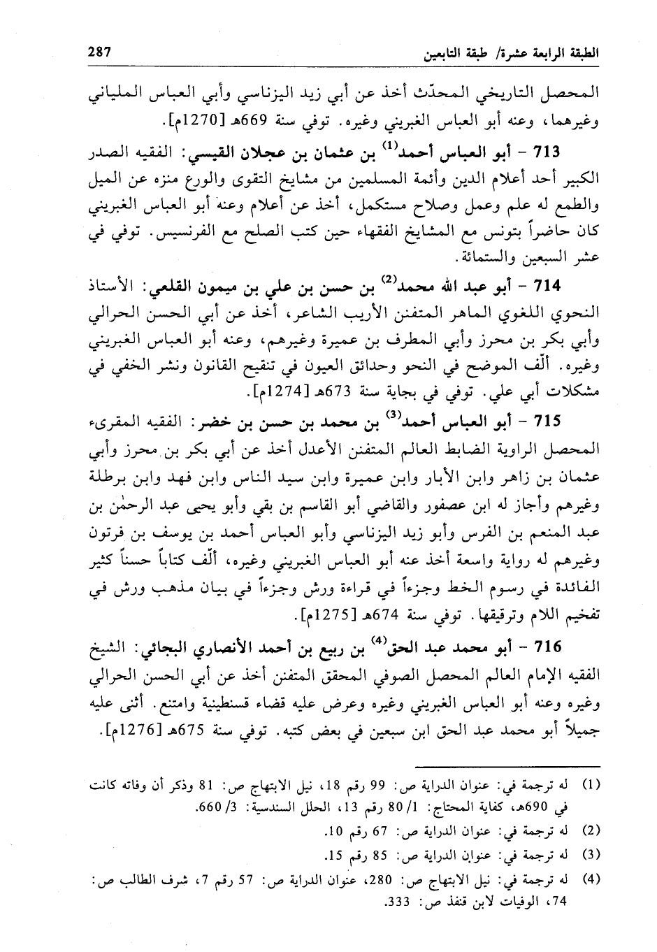 714 - أبو عبد الله محمد بن حسن بن علي بن ميمون القلعي: الأستاذ النحوي اللغوي الماهر المتفنن الأريب الشاعر، أخذ عن أبي الحسن الحرالي وأبي بكر بن محرز وأبي المطرف بن عميرة وغيرهم، وعنه أبو العباس الغبريني وغيره. ألّف الموضح في النحو وحدائق العيون في تنقيح القانون ونشر الخفي في مشكلات أبي علي. توفي في بجاية سنة 673 هـ[1274م].