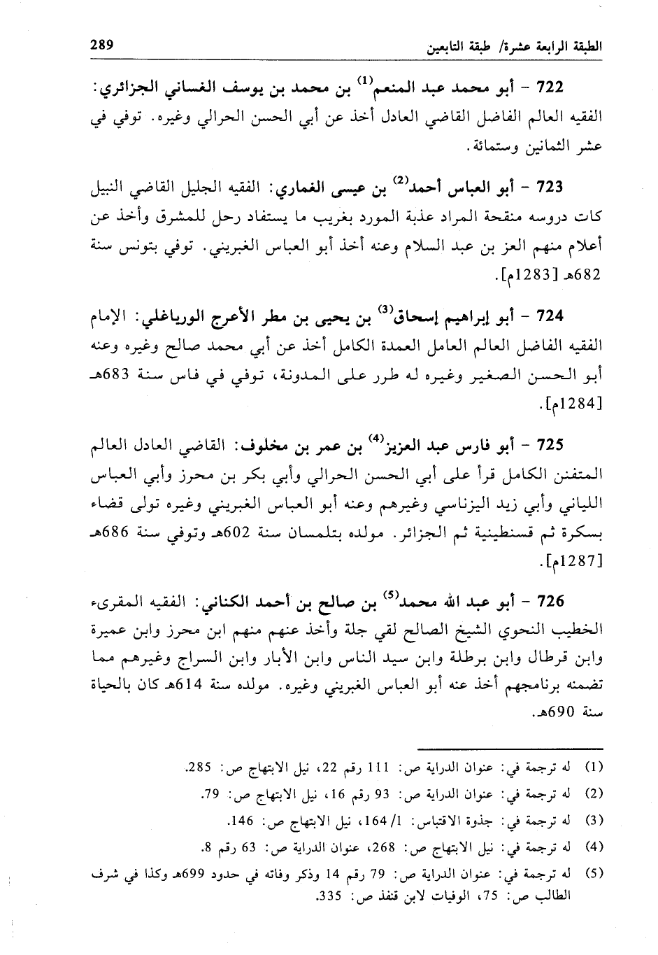 722 - أبو محمد عبد المنعم بن محمد بن يوسف الغساني الجزائري: الفقيه العالم الفاضل القاضي العادل أخذ عن أبي الحسن الحرالي وغيره. توفي في عشر الثمانين وستمائة.