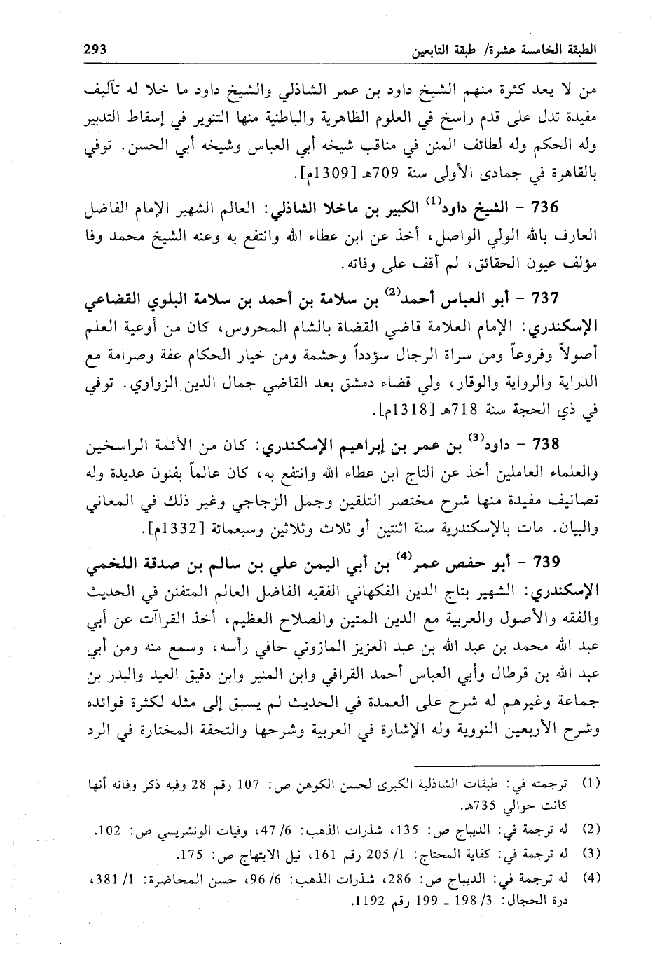 736 - الشيخ داود الكبير بن ماخلا الشاذلي: العالم الشهير الإِمام الفاضل العارف بالله الولي الواصل، أخذ عن ابن عطاء الله وانتفع به وعنه الشيخ محمد وفا مؤلف عيون الحقائق، لم أقف على وفاته.