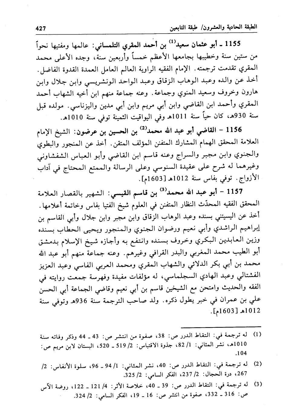 1157 - أبو عبد الله محمَّد بن قاسم القيسي: الشهير بالقصار العلامة المحقق الفقيه المحدّث النظار المتفنن في العلوم شيخ الفتيا بفاس وخاتمة أعلامها. أخذ عن اليسيتني بسنده وعبد الوهاب الزقاق وابن مجبر وابن جلال وأبي القاسم بن إبراهيم الراشدي وأبي نعيم ورضوان الجنوي والمنجور ويحيى الحطاب بسنده وزين العابدين البكري وخروف بسنده وانتفع به وأجازه شيخ الإِسلام بدمشق أبو الطيب محمَّد المغربي والبدر القرافي وغيرهم. وعنه جماعة منهم أبو عبد الله محمَّد بن أبي بكر الدلائي والشهاب المقري ومحمد العربي الفاسي وعبد العزيز الفشتالي وعبد الهادي السجلماسي، له مؤلفات مفيدة وفهرسة جمعت روايته في الفقه والحديث وامتحن مع الشيخين قاسم بن أبي نعيم وقاضي الجماعة أبي الحسن عليه ابن عمران في خبر يطول ذكره. ولد صاحب الترجمة سنة 936 هـ وتوفي سنة 1012هـ[1603م].