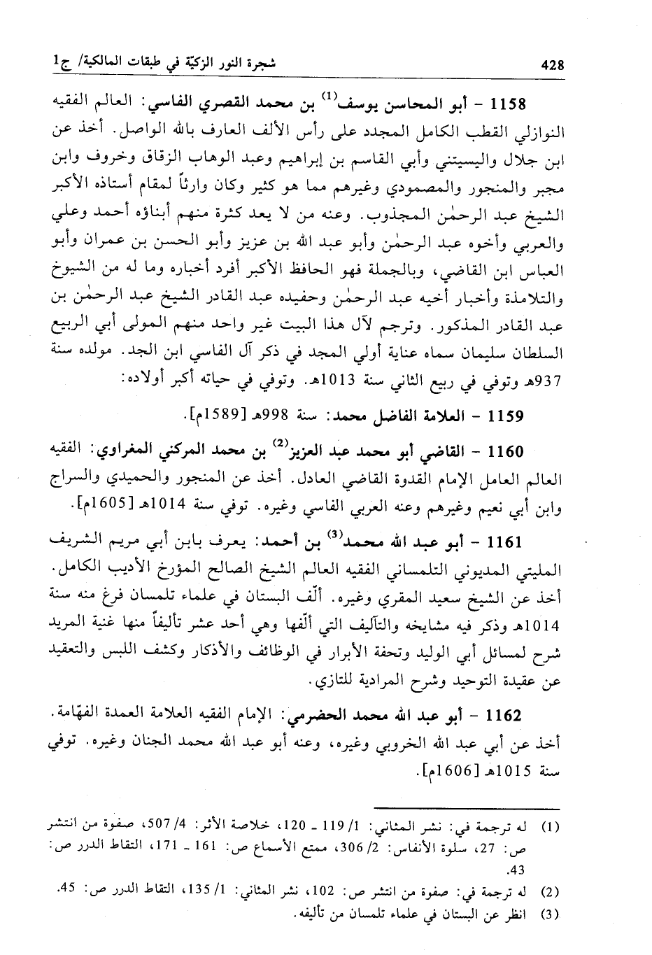 1158 - أبو المحاسن يوسف بن محمَّد القصري الفاسي: العالم الفقيه النوازلي القطب الكامل المجدد على رأس الألف العارف بالله الواصل. أخذ عن ابن جلال واليسيتني وأبي القاسم بن إبراهيم وعبد الوهاب الزقاق وخروف وابن مجبر والمنجور والمصمودي وغيرهم مما هو كثير وكان وارثاً لمقام أستاذه الأكبر الشيخ عبد الرحمن المجذوب. وعنه من لا يعد كثرة منهم أبناؤه أحمد وعلي والعربي وأخوه عبد الرحمن وأبو عبد الله بن عزيز وأبو الحسن بن عمران وأبو العباس ابن القاضي، وبالجملة فهو الحافظ الأكبر أفرد أخباره وما له من الشيوخ والتلامذة وأخبار أخيه عبد الرحمن وحفيده عبد القادر الشيخ عبد الرحمن بن عبد القادر المذكور. وترجم لآل هذا البيت غير واحد منهم المولى أبي الربيع السلطان سليمان سماه عناية أولي المجد في ذكر آل الفاسي ابن الجد. مولده سنة 937 هـ وتوفي في ربيع الثاني سنة 1013 هـ. وتوفي في حياته أكبر أولاده: