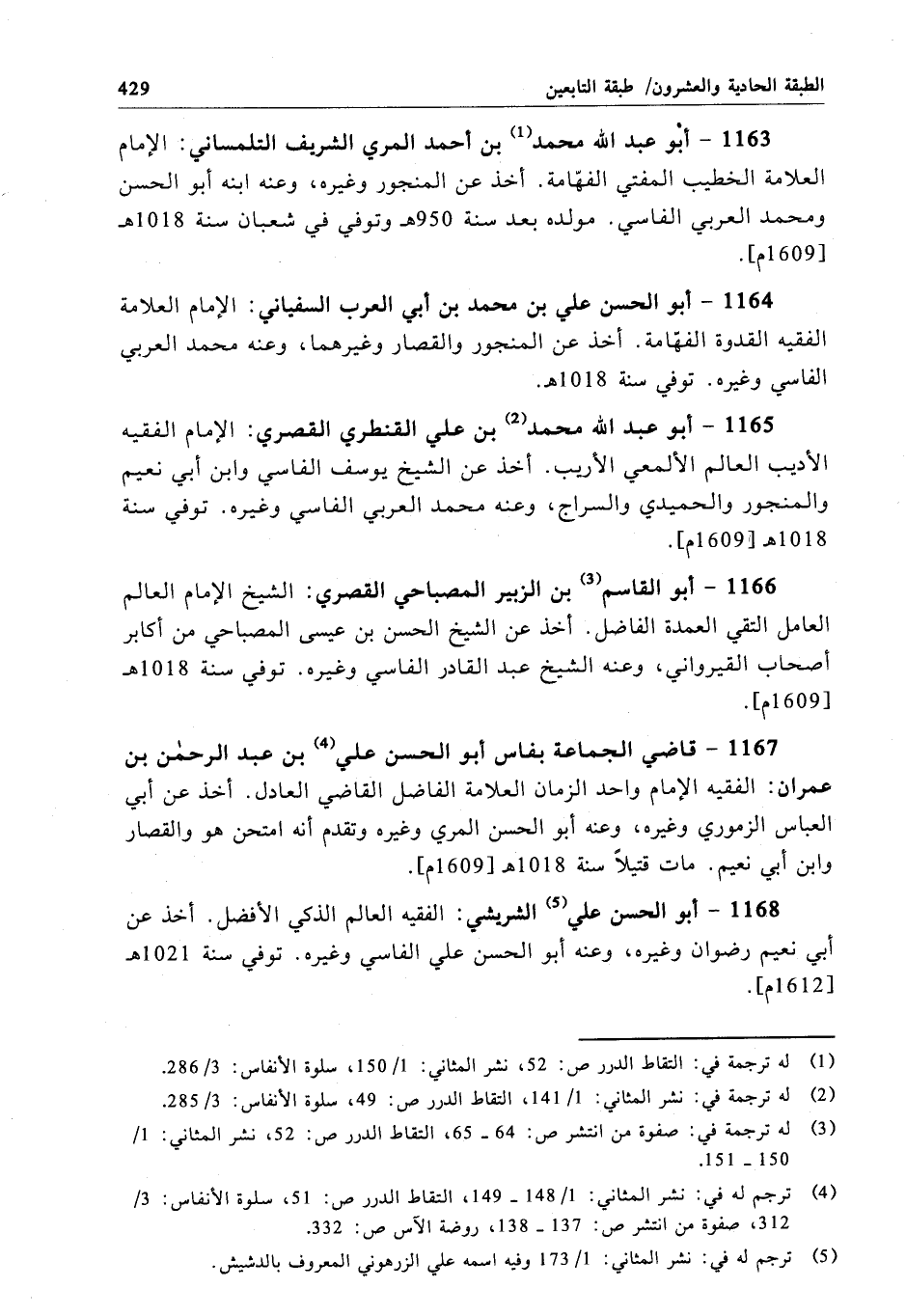 1167 - قاضي الجماعة بفاس أبو الحسن علي بن عبد الرحمن بن عمران: الفقيه الإِمام واحد الزمان العلامة الفاضل القاضي العادل. أخذ عن أبي العباس الزموري وغيره، وعنه أبو الحسن المري وغيره وتقدم أنه امتحن هو والقصار وابن أبي نعيم. مات قتيلاً سنة 1018 هـ[1609م].