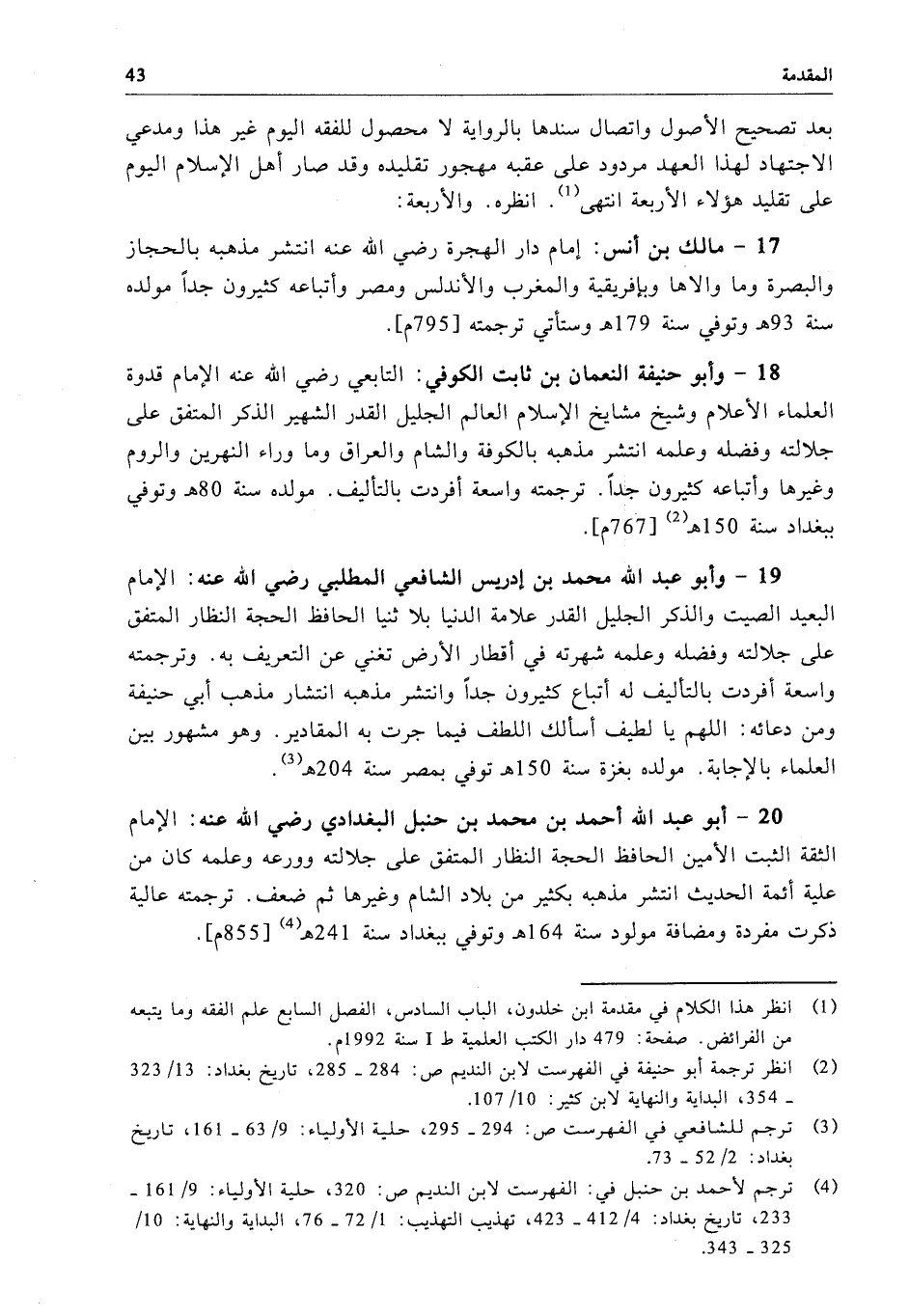 17 - مالك بن أنس: إمام دار الهجرة رضي الله عنه انتشر مذهبه بالحجاز والبصرة وما والاها وبإفريقية والمغرب والأندلس ومصر وأتباعه كثيرون جداً مولده سنة 93 هـ وتوفي سنة 179هـ وستأتي ترجمته [795 م].