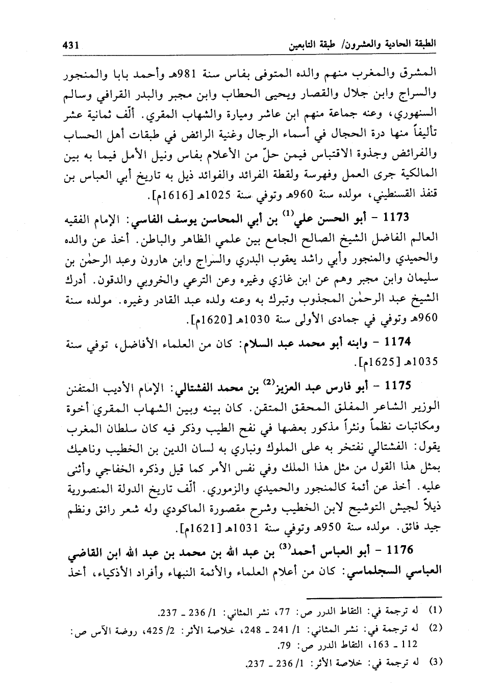 1176 - أبو العباس أحمد بن عبد الله بن محمَّد بن عبد الله ابن القاضي العباسي السجلماسي: كان من أعلام العلماء والأئمة النبهاء وأفراد الأذكياء، أخذ