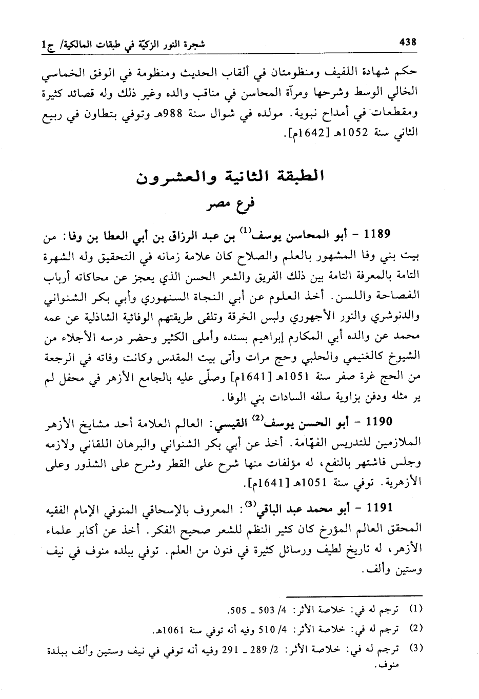 1189 - أبو المحاسن يوسف بن عبد الرزاق بن أبي العطا بن وفا: من بيت بني وفا المشهور بالعلم والصلاح كان علامة زمانه في التحقيق وله الشهرة التامة بالمعرفة التامة بين ذلك الفريق والشعر الحسن الذي يعجز عن محاكاته أرباب الفصاحة واللسن. أخذ العلوم عن أبي النجاة السنهوري وأبي بكر الشنواني والدنوشري والنور الأجهوري ولبس الخرقة وتلقى طريقتهم الوفائية الشاذلية عن عمه محمَّد عن والده أبي المكارم إبراهيم بسنده وأملى الكثير وحضر درسه الأجلاء من الشيوخ كالغنيمي والحلبي وحج مرات وأتى بيت المقدس وكانت وفاته في الرجعة من الحج غرة صفر سنة 1051 هـ[1641م]، وصلّى عليه بالجامع الأزهر في محفل لم ير مثله ودفن بزاوية سلفه السادات بني الوفا.