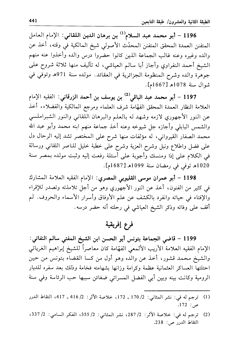 1196 - أبو محمَّد عبد السلام بن برهان الدين اللقاني: الإِمام العامل المتفنن العمدة المحقق المتفنن المحدّث الأصولي شيخ المالكية في وقته، أخذ عن والده وغيره وعنه غالب الجماعة الذين كانوا حضروا درس والده وأخذوا عنه منهم الشيخ أحمد النفراوي وأجاز أبا سالم العياشي، له تأليف منها ثلاثة شروح على جوهرة والده وشرح المنظومة الجزائرية في العقائد. مولده سنة 971 هـ وتوفي في شوال سنة 1078هـ[1667م].