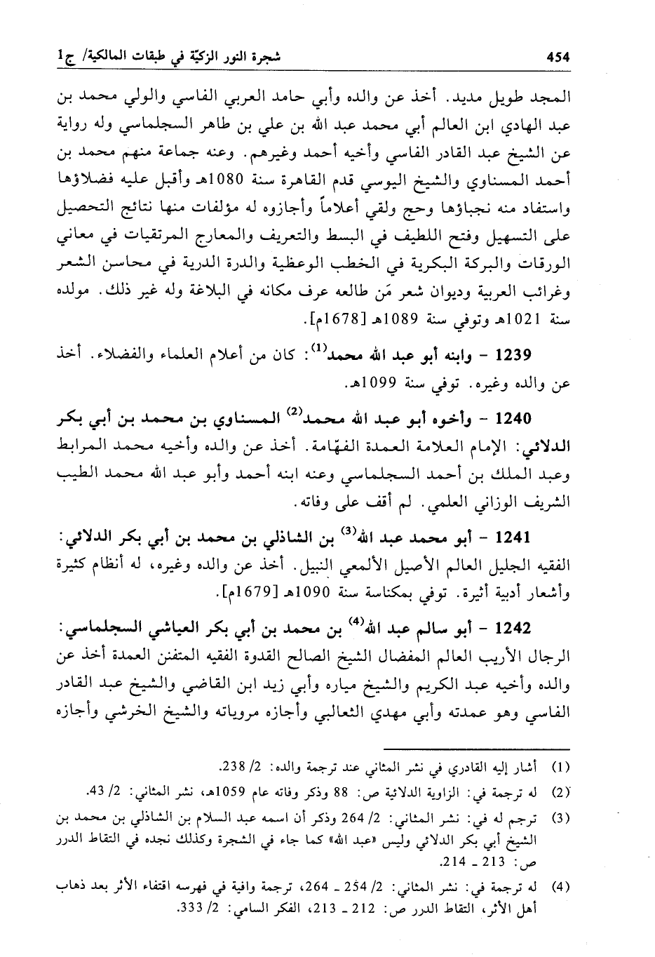 1240 - وأخوه أبو عبد الله محمد المسناوي بن محمد بن أبي بكر الدلائي: الإِمام العلامة العمدة الفهّامة. أخذ عن والده وأخيه محمد المرابط وعبد الملك بن أحمد السجلماسي وعنه ابنه أحمد وأبو عبد الله محمد الطيب الشريف الوزاني العلمي. لم أقف على وفاته.