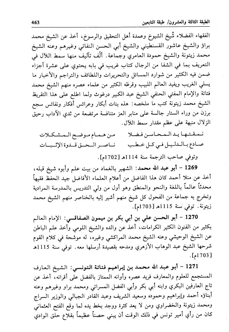 1271 - أبو عبد الله محمد بن إبراهيم فتاتة التونسي: الشيخ العارف المستجمع للعلوم والمعارف فريد عصره وأوانه الممتاز بالفضل على أقرانه، أخذ عن تاج العارفين البكري وابنه أبي بكر وأبي الفضل المسراتي ومحمد براو وغيرهم وعنه أبناؤه أحمد وإبراهيم وحموده وسعيد الشريف وعبد القادر الجبالي والوزير السراج ومحمد زيتونة والخضراوي ومن لا يعد كثرة ووجد بخط يده لما وقع الفتح العثماني كان من رأي أمير تونس في ذلك الوقت أن يبني حصناً عظيماً بقلاع حلق الوادي