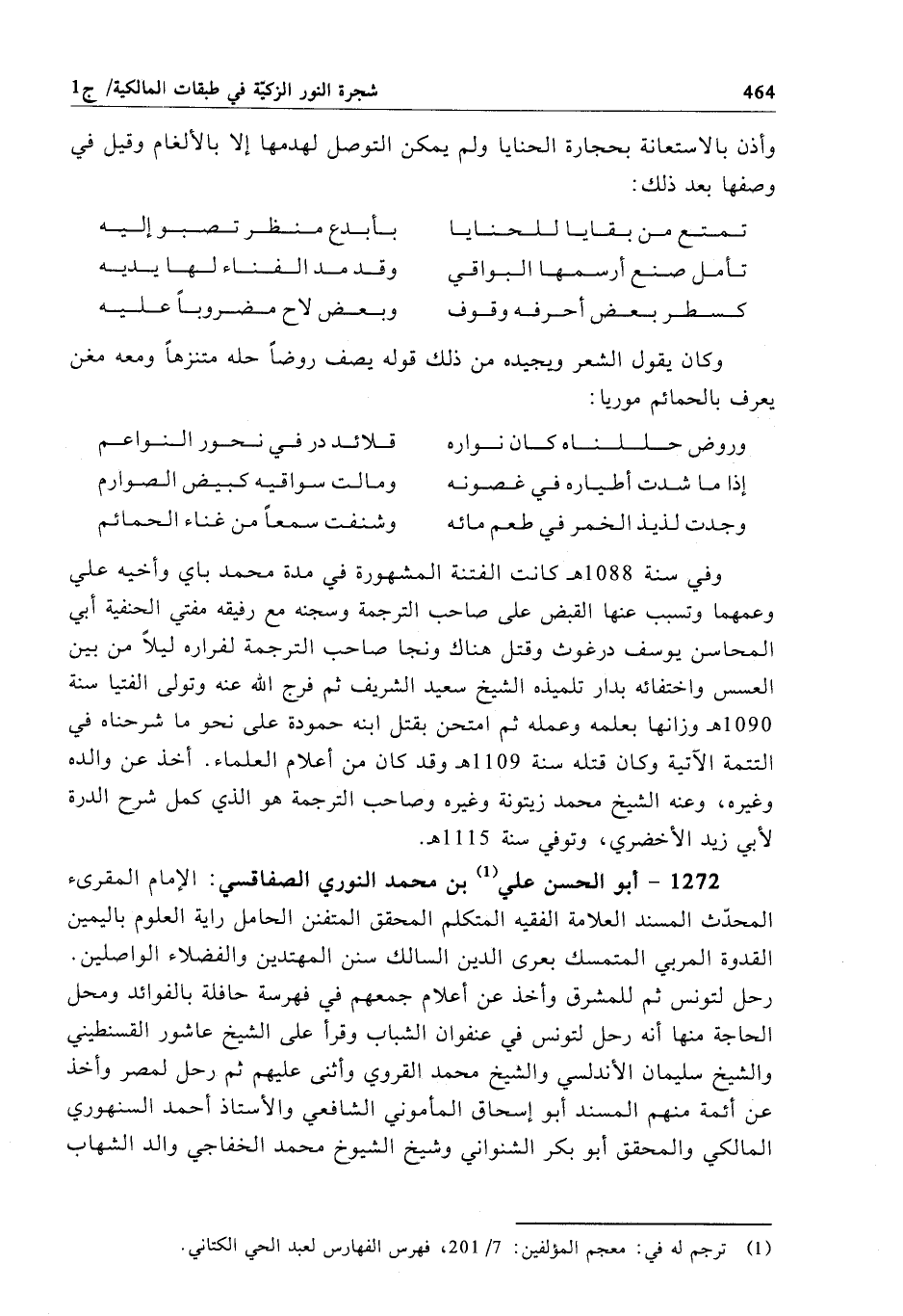 1272 - أبو الحسن علي بن محمد النوري الصفاقسي: الإمام المقرىء المحدّث المسند العلامة الفقيه المتكلم المحقق المتفنن الحامل راية العلوم باليمين القدوة المربي المتمسك بعرى الدين السالك سنن المهتدين والفضلاء الواصلين. رحل لتونس ثم للمشرق وأخذ عن أعلام جمعهم في فهرسة حافلة بالفوائد ومحل الحاجة منها أنه رحل لتونس في عنفوان الشباب وقرأ على الشيخ عاشور القسنطيني والشيخ سليمان الأندلسي والشيخ محمد القروي وأثنى عليهم ثم رحل لمصر وأخذ عن أئمة منهم المسند أبو إسحاق المأموني الشافعي والأستاذ أحمد السنهوري المالكي والمحقق أبو بكر الشنواني وشيخ الشيوخ محمد الخفاجي والد الشهاب