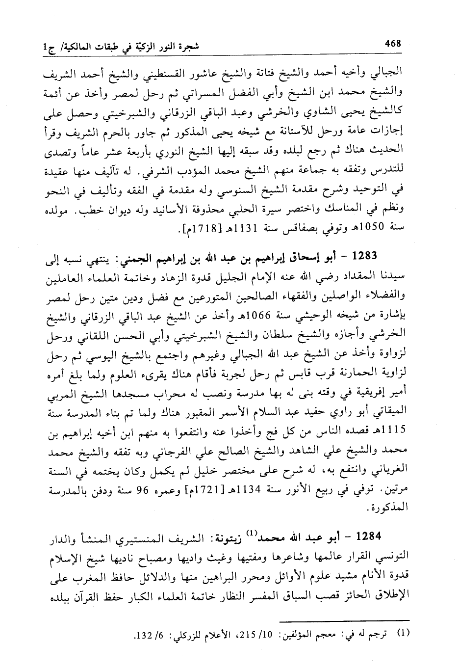 1283 - أبو إسحاق إبراهيم بن عبد الله بن إبراهيم الجمني: ينتهي نسبه إلى سيدنا المقداد رضي الله عنه الإمام الجليل قدوة الزهاد وخاتمة العلماء العاملين والفضلاء الواصلين والفقهاء الصالحين المتورعين مع فضل ودين متين رحل لمصر بإشارة من شيخه الوحيشي سنة 1066 هـ وأخذ عن الشيخ عبد الباقي الزرقاني والشيخ الخرشي وأجازه والشيخ سلطان والشيخ الشبرخيتي وأبي الحسن اللقاني ورحل لزواوة وأخذ عن الشيخ عبد الله الجبالي وغيرهم واجتمع بالشيخ اليوسي ثم رحل لزاوية الحمارنة قرب قابس ثم رحل لجربة فأقام هناك يقرىء العلوم ولما بلغ أمره أمير إفريقية في وقته بنى له بها مدرسة ونصب له محراب مسجدها الشيخ المربي الميقاتي أبو راوي حفيد عبد السلام الأسمر المقبور هناك ولما تم بناء المدرسة سنة 1115هـ قصده الناس من كل فج وأخذوا عنه وانتفعوا به منهم ابن أخيه إبراهيم بن محمد والشيخ علي الشاهد والشيخ الصالح علي الفرجاني وبه تفقه والشيخ محمد الغرياني وانتفع به، له شرح على مختصر خليل لم يكمل وكان يختمه في السنة مرتين. توفي في ربيع الأنور سنة 1134هـ[1721 م]، وعمره 96 سنة ودفن بالمدرسة المذكورة.