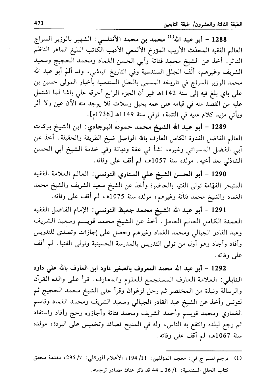 1288 - أبو عبد الله محمد بن محمد الأندلسي: الشهير بالوزير السراج العالم الفقيه المحدّث الأريب المؤرخ الألمعي الأديب الكاتب البليغ الماهر الناظم الناثر. أخذ عن الشيخ محمد فتاتة وأبي الحسن الغماد ومحمد الحجيج وسعيد الشريف وغيرهم، ألّف الجلل السندسية وفي التاريخ الباشي، وقد ألمّ أبو عبد الله محمد الوزير السراج في تاريخه المسمى بالحلل السندسية بأخبار المولى حسين بن علي باي بلغ فيه إلى سنة 1142 هـ غير أن الجزء الرابع أحرقه علي باشا لما اشتمل عليه من القصد منه في قيامه على عمه بحبل وسلات فلا يوجد منه الآن عين ولا أثر ويأتي مزيد كلام عليه في التتمة، توفي سنة 1149 هـ[1736 م].