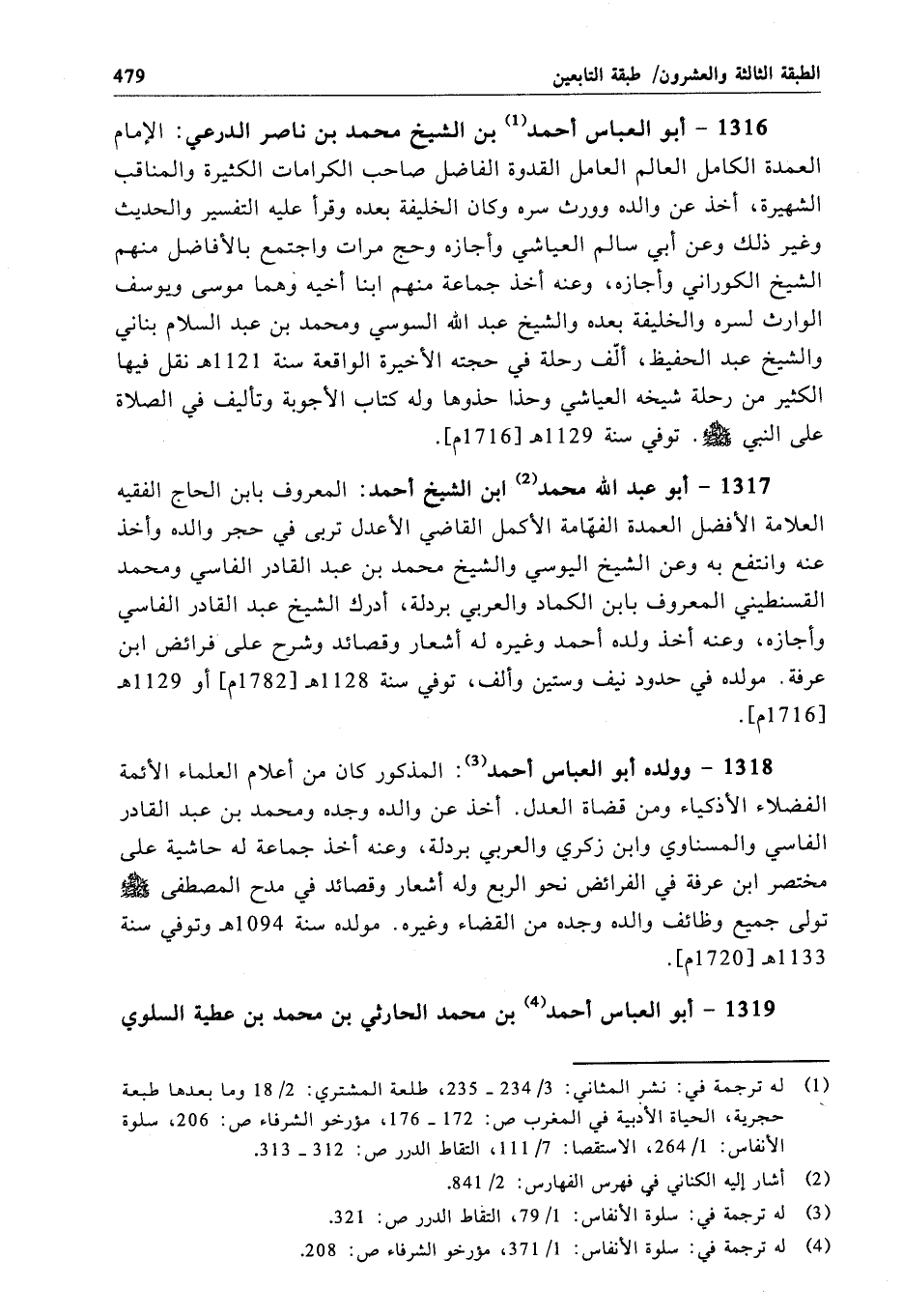 1316 - أبو العباس أحمد بن الشيخ محمد بن ناصر الدرعي: الإمام العمدة الكامل العالم العامل القدوة الفاضل صاحب الكرامات الكثيرة والمناقب الشهيرة، أخذ عن والده وورث سره وكان الخليفة بعده وقرأ عليه التفسير والحديث وغير ذلك وعن أبي سالم العياشي وأجازه وحج مرات واجتمع بالأفاضل منهم الشيخ الكوراني وأجازه، وعنه أخذ جماعة منهم ابنا أخيه وهما موسى ويوسف الوارث لسره والخليفة بعده والشيخ عبد الله السوسي ومحمد بن عبد السلام بناني والشيخ عبد الحفيظ، ألّف رحلة في حجته الأخيرة الواقعة سنة 1121 هـ نقل فيها الكثير من رحلة شيخه العياشي وحذا حذوها وله كتاب الأجوبة وتأليف في الصلاة على النبي - صلى الله عليه وسلم -. توفي سنة 1129 هـ[1716 م].