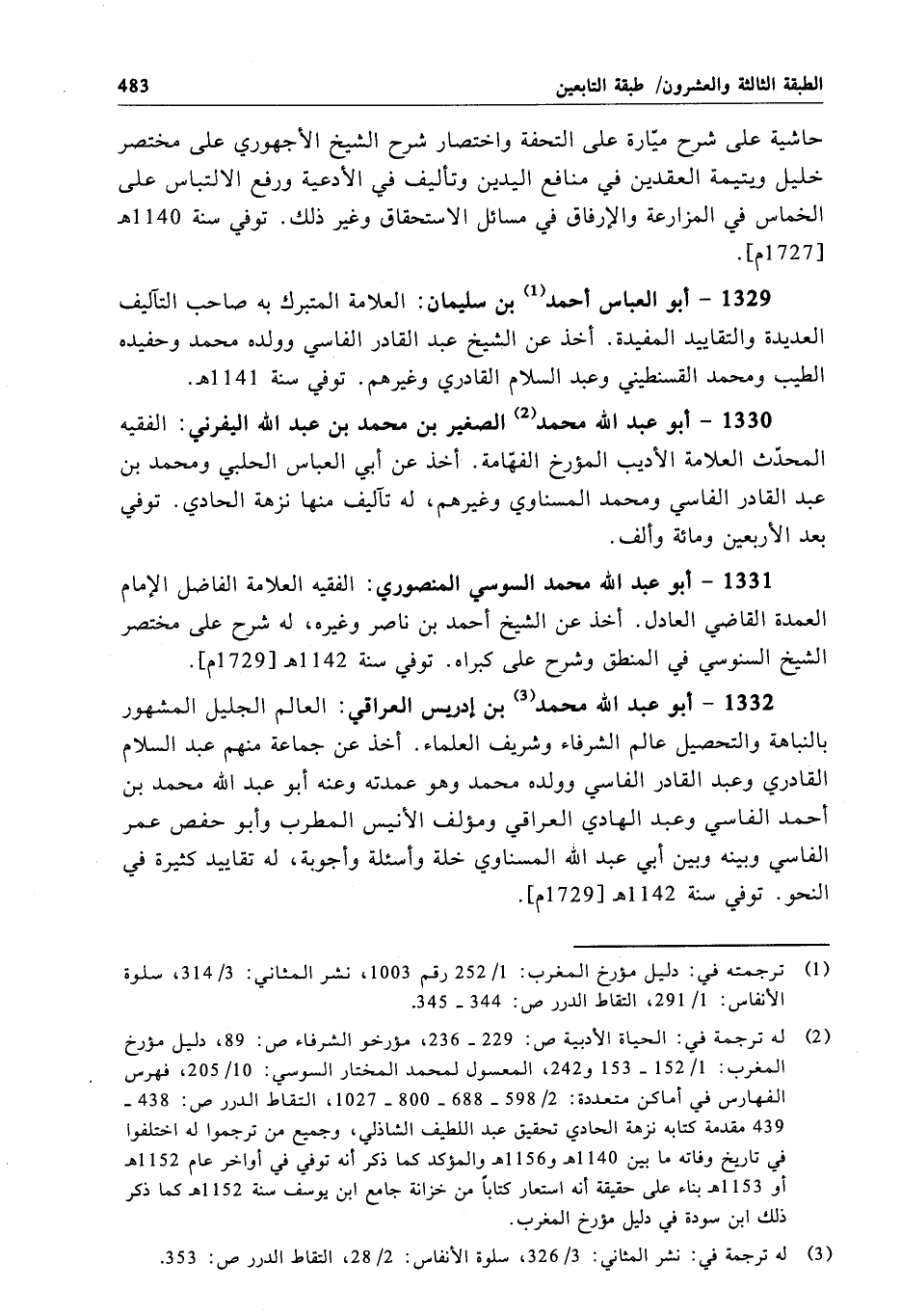 1330 - أبو عبد الله محمد الصغير بن محمد بن عبد الله اليفرني: الفقيه المحدّث العلامة الأديب المؤرخ الفهّامة. أخذ عن أبي العباس الحلبي ومحمد بن عبد القادر الفاسي ومحمد المسناوي وغيرهم، له تآليف منها نزهة الحادي. توفي بعد الأربعين ومائة وألف.