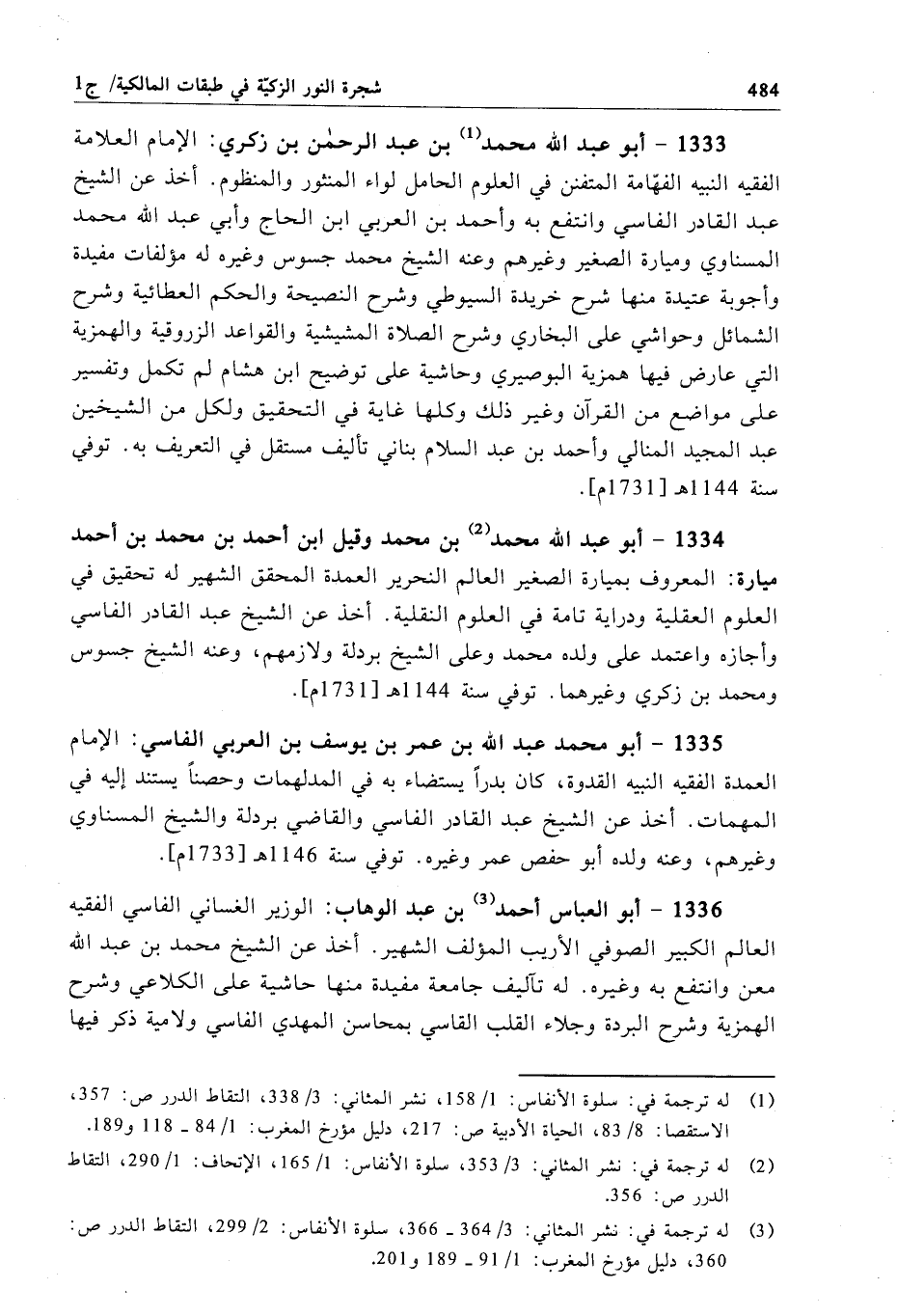 1333 - أبو عبد الله محمَّد بن عبد الرحمن بن زكري: الإِمام العلامة الفقيه النبيه الفهّامة المتفنن في العلوم الحامل لواء المنثور والمنظوم. أخذ عن الشيخ عبد القادر الفاسي وانتفع به وأحمد بن العربي ابن الحاج وأبي عبد الله محمَّد المسناوي وميارة الصغير وغيرهم وعنه الشيخ محمَّد جسوس وغيره له مؤلفات مفيدة وأجوبة عتيدة منها شرح خريدة السيوطي وشرح النصيحة والحكم العطائية وشرح الشمائل وحواشي على البخاري وشرح الصلاة المشيشية والقواعد الزروقية والهمزية التي عارض فيها همزية البوصيري وحاشية على توضيح ابن هشام لم تكمل وتفسير على مواضع من القرآن وغير ذلك وكلها غاية في التحقيق ولكل من الشيخين عبد المجيد المنالي وأحمد بن عبد السلام بناني تأليف مستقل في التعريف به. توفي سنة 1144 هـ[1731 م].