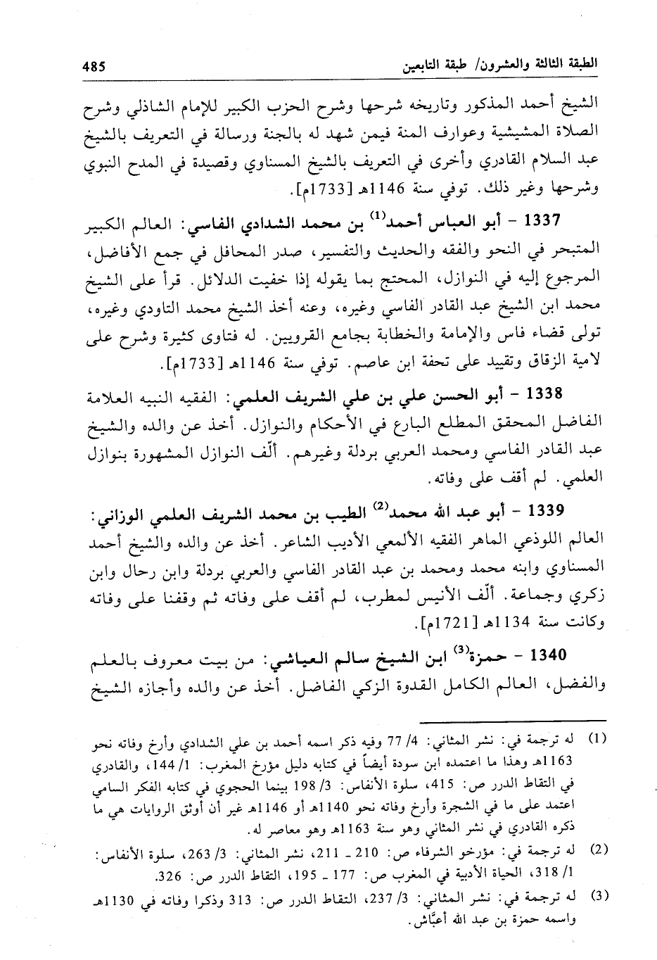 1339 - أبو عبد الله محمَّد الطيب بن محمَّد الشريف العلمي الوزاني: العالم اللوذعي الماهر الفقيه الألمعي الأديب الشاعر. أخذ عن والده والشيخ أحمد المسناوي وابنه محمَّد ومحمد بن عبد القادر الفاسي والعربي بردلة وابن رحال وابن زكري وجماعة. ألّف الأنيس لمطرب، لم أقف على وفاته ثم وقفنا على وفاته وكانت سنة 1134 هـ[1721 م].