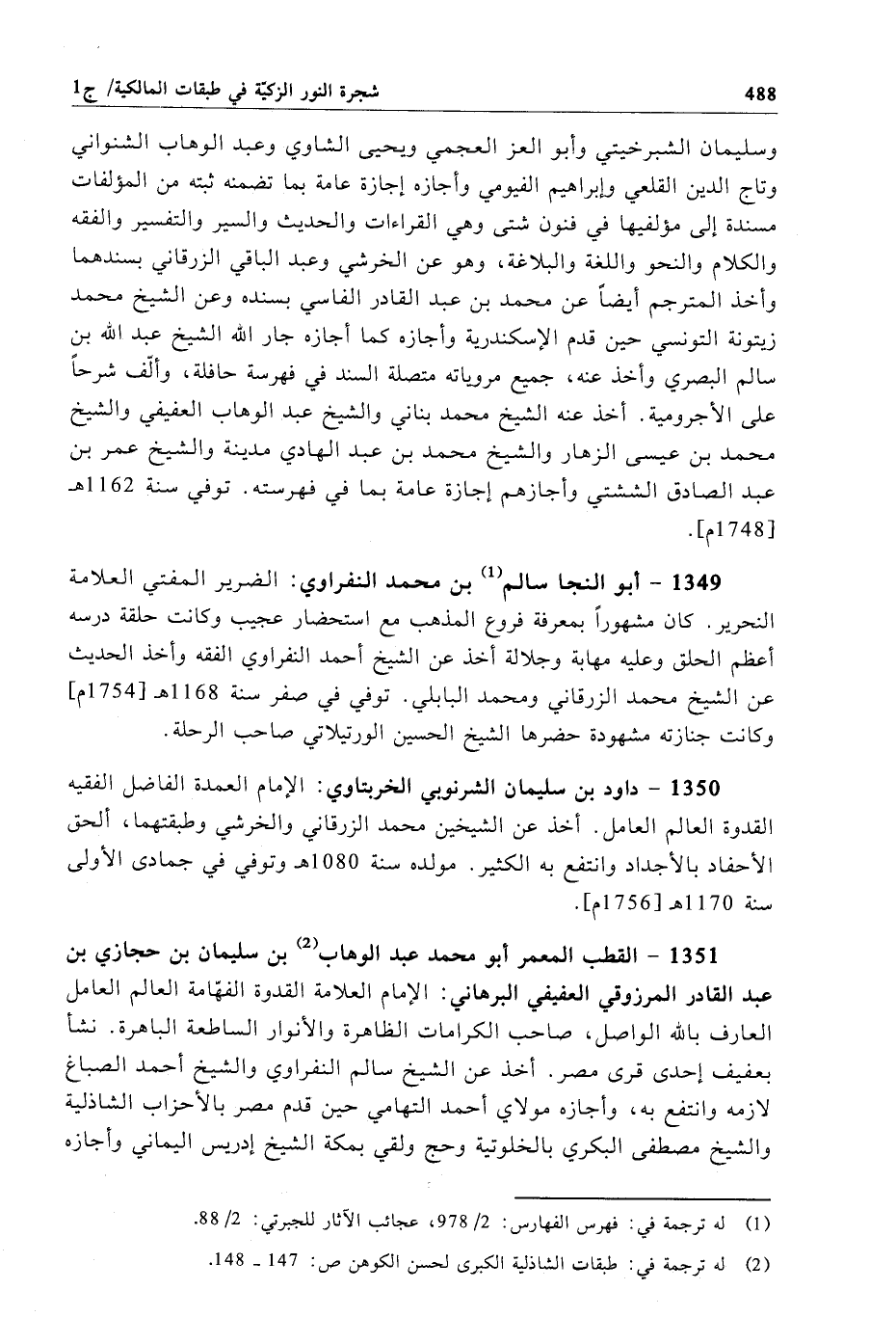 1349 - أبو النجا سالم بن محمَّد النفراوي: الضرير المفتي العلامة النحرير. كان مشهوراً بمعرفة فروع المذهب مع استحضار عجيب وكانت حلقة درسه أعظم الحلق وعليه مهابة وجلالة أخذ عن الشيخ أحمد النفراوي الفقه وأخذ الحديث عن الشيخ محمَّد الزرقاني ومحمد البابلي. توفي في صفر سنة 1168 هـ[1754 م] وكانت جنازته مشهودة حضرها الشيخ الحسين الورتيلاتي صاحب الرحلة.