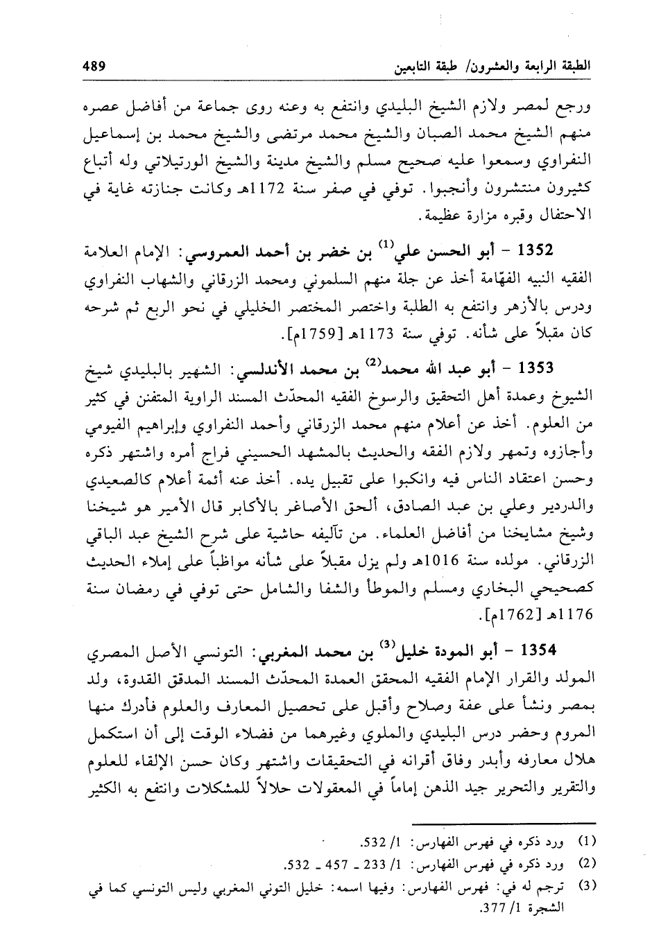 1354 - أبو المودة خليل بن محمَّد المغربي: التونسي الأصل المصري المولد والقرار الإِمام الفقيه المحقق العمدة المحدّث المسند المدقق القدوة، ولد بمصر ونشأ على عفة وصلاح وأقبل على تحصيل المعارف والعلوم فأدرك منها المروم وحضر درس البليدي والملوي وغيرهما من فضلاء الوقت إلى أن استكمل هلال معارفه وأبدر وفاق أقرانه في التحقيقات واشتهر وكان حسن الإلقاء للعلوم والتقرير والتحرير جيد الذهن إماماً في المعقولات حلالاً للمشكلات وانتفع به الكثير