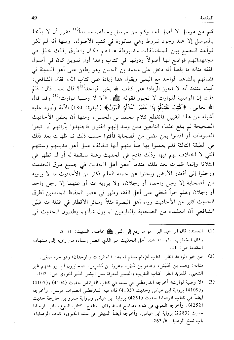 كم من مرسل لا أصل له، وكم من مرسل يخالف مسنداً (1) فقرر أن لا يأخذ بالمرسل إلا عند وجود شروط وهي مذكورة في كتب الأصول، ومنها أنه لم تكن قواعد الجمع بين المختلفات مضبوطة عندهم فكان يتطرق بذلك خلل في مجتهداتهم فوضع لها أصولاً ودوّنها في كتاب وهذا أول تدوين كان في أصول الفقه مثاله ما بلغنا أنه دخل على محمد بن الحسن وهو يطعن علي أهل المدينة في قضائهم بالشاهد الواحد مع اليمين ويقول هذا زيادة على كتاب الله، فقال الشافعي: أثبت عندك أنه لا تجوز الزيادة على كتاب الله بخبر الواحد؟ قال نعم. قال: فلمَ قلت إن الوصية للوارث لا تجوز لقوله - صلى الله عليه وسلم -: "ألا لا وصية لوارث" وقد قال الله تعالى: {كُتِبَ عَلَيْكُمْ إِذَا حَضَرَ أَحَدَكُمُ الْمَوْتُ} [البقرة: 180] الآية وأورد عليه أشياء من هذا القبيل فانقطع كلام محمَّد بن الحسن، ومنها أن بعض الأحاديث الصحيحة لم يبلغ علماء التابعين ممن وسد إليهم الفتوى فاجتهدوا بآرائهم أو اتبعوا العمومات أو اقتدوا بمن مضى من الصحابة فأفتوا حسب ذلك ثم ظهرت بعد ذلك في الطبقة الثالثة فلم يعملوا بها ظناً منهم أنها تخالف عمل أهل مدينتهم وسنتهم التي لا اختلاف لهم فيها وذلك قادح في الحديث وعلة مسقطة له أو لم تظهر في الثلاثة وإنما ظهرت بعد ذلك عندما أمعن أهل الحديث في جميع طرق الحديث ورحلوا إلى أقطار الأرض وبحثوا عن حملة العلم فكثر من الأحاديث ما لا يرويه من الصحابة إلا رجل واحد، أو رجلان، ولا يرويه عنه أو عنهما إلا رجل واحد أو رجلان وهلم جراً فخفي على أهل الفقه وظهر في عصر الحفاظ الجامعين لطرق الحديث كثير من الأحاديث رواه أهل البصرة مثلاً وسائر الأقطار في غفلة منه فبيّن الشافعي أن العلماء من الصحابة والتابعين لم يزل شأنهم يطلبون الحديث في