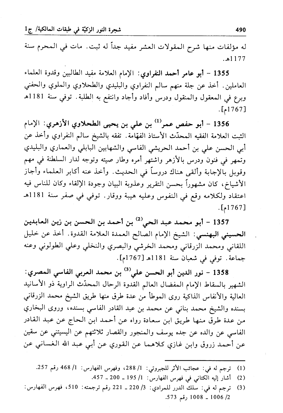 1355 - أبو عامر أحمد النفراوي: الإِمام العلامة مفيد الطالبين وقدوة العلماء العاملين. أخذ عن جلة منهم سالم النفراوي والبليدي والطحلاوي والملوي والحفني وبرع في المعقول والمنقول ودرس وأفاد وأجاد وانتفع به الطلبة. توفي سنة 1181 هـ[1767م].