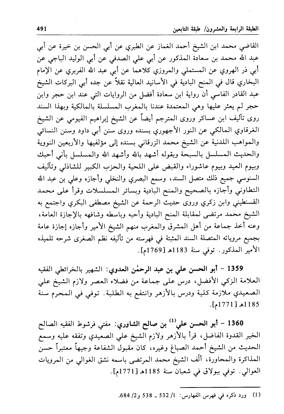 1359 - أبو الحسن علي بن عبد الرحمن العدوي: الشهير بالخرائطي الفقيه العلامة الزكي الأفضل، درس على جماعة من فضلاء العصر ولازم الشيخ علي الصعيدي ملازمة كلية ودرس بالأزهر وانتفع به الطلبة. توفي في المحرم سنة 1185 هـ[1771م].