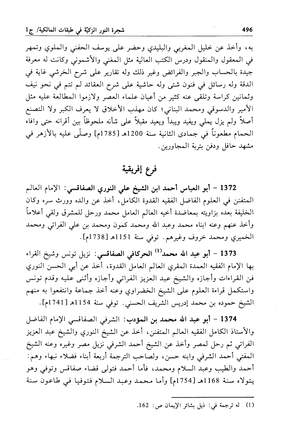 1373 - أبو عبد الله محمَّد الحركافي الصفاقسي: نزيل تونس وشيخ القراء بها الإِمام الفقيه العمدة المقري العالم العامل القدوة، أخذ عن أبي الحسن النوري فن القراءات وأجازه والشيخ عبد العزيز الفراتي وأجازه وأثنى عليه وقدم تونس واستكمل قراءة العلوم على الشيخ الخضراوي وعنه أخذ جماعة وانتفعوا به منهم الشيخ حموده بن محمَّد إدريس الشريف الحسني. توفي سنة 1154 هـ[1741م].