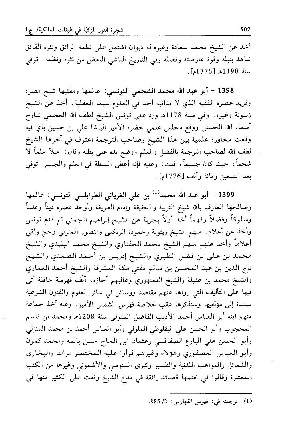 1398 - أبو عبد الله محمَّد الشحمي التونسي: عالمها ومفتيها شيخ مصره وفريد عصره الفقيه الذي لا يدانيه أحد في العلوم سيما العقلية. أخذ عن الشيخ زيتونة وغيره. وفي سنة 1178 هـ ورد على تونس الشيخ لطف الله العجمي شارح أسماء الله الحسنى ووقع مجلس علمي حضره الأمير الباشا علي بن حسين بأي فيه وقعت محاورة علمية بين هذا الشيخ وصاحب الترجمة اعترف في آخرها الشيخ لطف الله لصاحب الترجمة بالفضل والعلم ووضع يده على بطنه وقال: امتلأ علماً لا شحماً، حيث كان جسيماً، قلت: وعليه فإنه أعطى البسطة في العلم والجسم. توفي بعد التسعين ومائة وألف [1776 م].