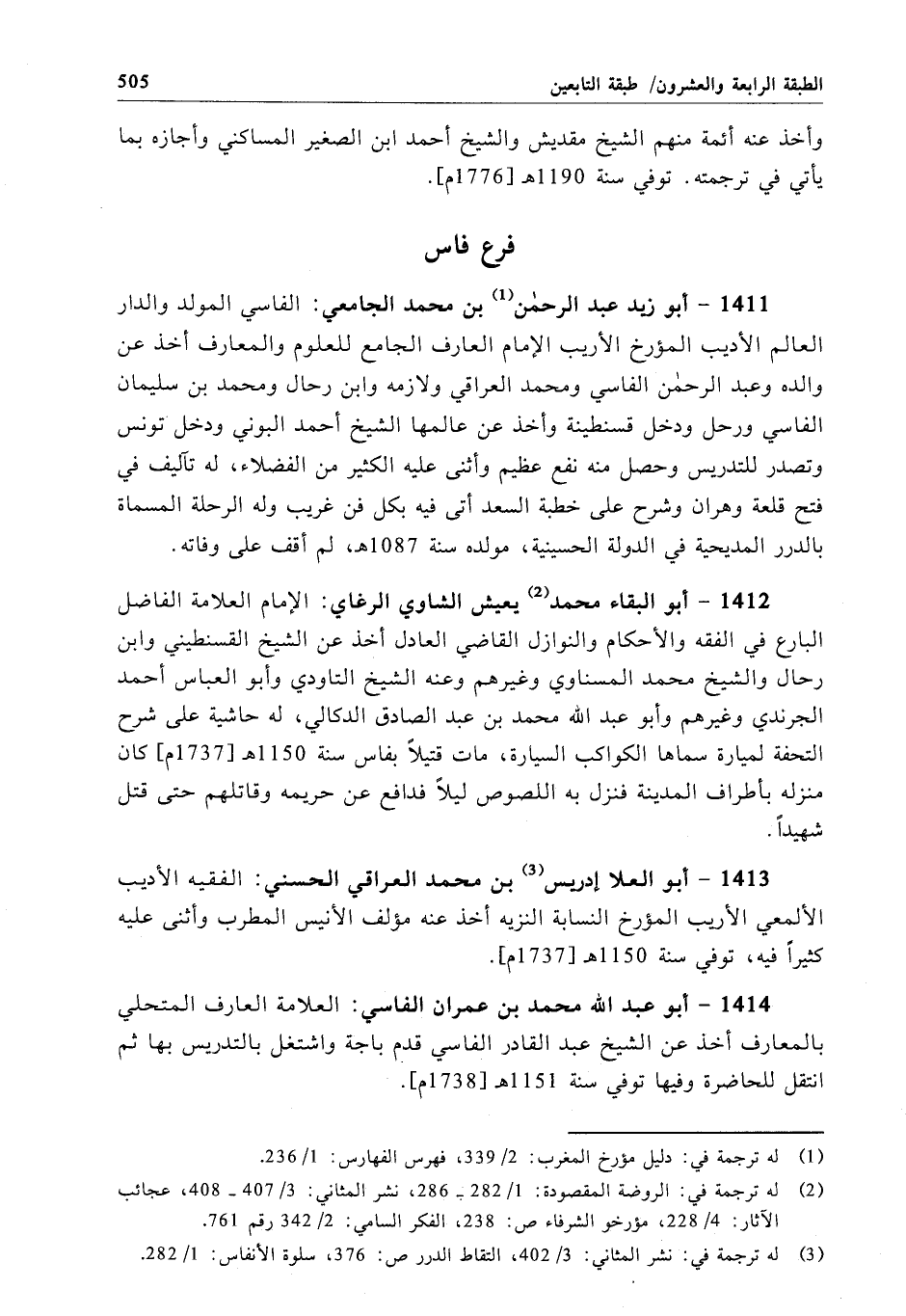 1411 - أبو زيد عبد الرحمن بن محمَّد الجامعي: الفاسي المولد والدار العالم الأديب المؤرخ الأريب الإِمام العارف الجامع للعلوم والمعارف أخذ عن والده وعبد الرحمن الفاسي ومحمد العراقي ولازمه وابن رحال ومحمد بن سليمان الفاسي ورحل ودخل قسنطينة وأخذ عن عالمها الشيخ أحمد البوني ودخل تونس وتصدر للتدريس وحصل منه نفع عظيم وأثنى عليه الكثير من الفضلاء، له تآليف في فتح قلعة وهران وشرح على خطبة السعد أتى فيه بكل فن غريب وله الرحلة المسماة بالدرر المديحية في الدولة الحسينية، مولده سنة 1087هـ، لم أقف على وفاته.