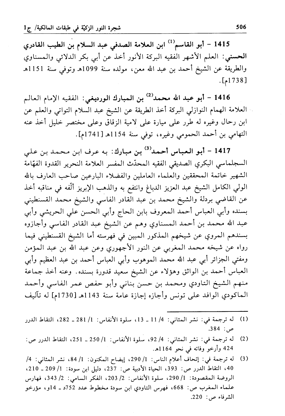 1415 - أبو القاسم ابن العلامة الصدفي عبد السلام بن الطيب القادري الحسني: العلم الأشهر الفقيه البركة الأنور أخذ عن أبي بكر الدلائي والمسناوي والطريقة عن الشيخ أحمد بن عبد الله معن، مولده سنة 1099 هـ وتوفي سنة 1151 هـ[1738 م].