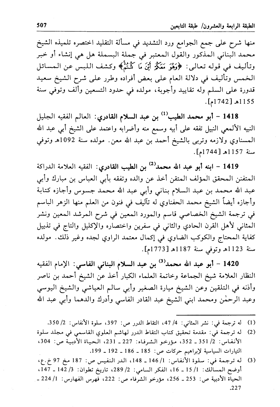 1418 - أبو محمد الطيب بن عبد السلام القادري: العالم الفقيه الجليل النبيه الألمعي النبيل تفقه على أبيه وسمع منه وأضرابه واعتمد على الشيخ أبي عبد الله المسناوي ولازمه وتربى بالشيخ أحمد بن عبد الله معن. مولده سنة 1092 هـ وتوفي سنة 1157 هـ[1744 م].