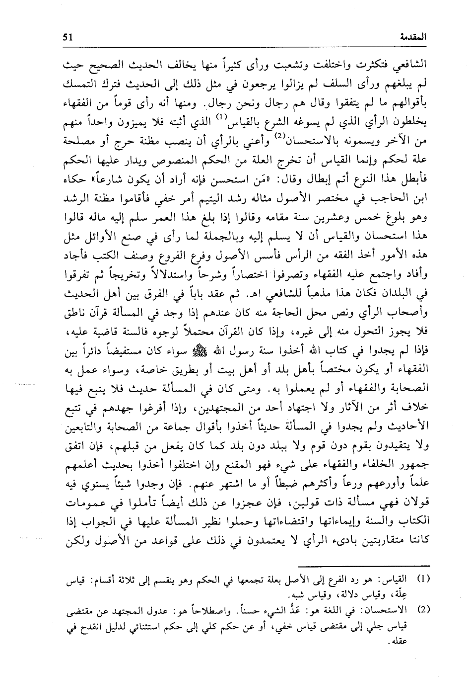 الشافعي فتكثرت واختلفت وتشعبت ورأى كثيراً منها يخالف الحديث الصحيح حيث لم يبلغهم ورأى السلف لم يزالوا يرجعون في مثل ذلك إلى الحديث فترك التمسك بأقوالهم ما لم يتفقوا وقال هم رجال ونحن رجال. ومنها أنه رأى قوماً من الفقهاء يخلطون الرأي الذي لم يسوغه الشرع بالقياس الذي أثبته فلا يميزون واحداً منهم من الآخر ويسمونه بالاستحسان وأعني بالرأي أن ينصب مظنة حرج أو مصلحة علة لحكم وإنما القياس أن تخرج العلة من الحكم المنصوص ويدار عليها الحكم فأبطل هذا النوع أتم إبطال وقال: "مَن استحسن فإنه أراد أن يكون شارعاً" حكاه ابن الحاجب في مختصر الأصول مثاله رشد اليتيم أمر خفي فأقاموا مظنة الرشد وهو بلوغ خمس وعشرين سنة مقامه وقالوا إذا بلغ هذا العمر سلم إليه ماله قالوا هذا استحسان والقياس أن لا يسلم إليه وبالجملة لما رأى في صنع الأوائل مثل هذه الأمور أخذ الفقه من الرأس فأسس الأصول وفرع الفروع وصنف الكتب فأجاد وأفاد واجتمع عليه الفقهاء وتصرفوا اختصاراً وشرحاً واستدلالاً وتخريجاً ثم تفرقوا في البلدان فكان هذا مذهباً للشافعي اهـ. ثم عقد باباً في الفرق بين أهل الحديث وأصحاب الرأي ونص محل الحاجة منه كان عندهم إذا وجد في المسألة قرآن ناطق فلا يجوز التحول منه إلى غيره، وإذا كان القرآن محتملاً لوجوه فالسنة قاضية عليه، فإذا لم يجدوا في كتاب الله أخذوا سنة رسول الله - صلى الله عليه وسلم - سواء كان مستفيضاً دائراً بين الفقهاء أو يكون مختصاً بأهل بلد أو أهل بيت أو بطريق خاصة، وسواء عمل به الصحابة والفقهاء أو لم يعملوا به. ومتى كان في المسألة حديث فلا يتبع فيها خلاف أثر من الآثار ولا اجتهاد أحد من المجتهدين، وإذا أفرغوا جهدهم في تتبع الأحاديث ولم يجدوا في المسألة حديثاً أخذوا بأقوال جماعة من الصحابة والتابعين ولا يتقيدون بقوم دون قوم ولا ببلد دون بلد كما كان يفعل من قبلهم، فإن اتفق جمهور الخلفاء والفقهاء على شيء فهو المقنع وإن اختلفوا أخذوا بحديث أعلمهم علماً وأورعهم ورعاً وأكثرهم ضبطاً أو ما اشتهر عنهم. فإن وجدوا شيئاً يستوي فيه قولان فهي مسألة ذات قولين، فإن عجزوا عن ذلك أيضاً تأملوا في عمومات الكتاب والسنة وإيماءاتها واقتضاءاتها وحملوا نظير المسألة عليها في الجواب إذا كانتا متقاربتين بادئ الرأي لا يعتمدون في ذلك على قواعد من الأصول ولكن