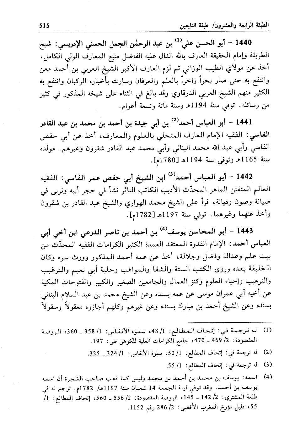 1443 - أبو المحاسن يوسف بن أحمد بن ناصر الدرعي ابن أخي أبي العباس أحمد: الإمام القدوة المعتقد العمدة الكثير الكرامات الفقيه المحدّث من بيت علم وعدالة وفضل وجلالة، أخذ عن عمه أحمد المذكور وورث سره وكان الخليفة بعده وروى الكتب الستة والشفا والمواهب وحلية أبي نعيم والترغيب والترهيب وإحياء العلوم وكنز العمال والجامعين الصغير والكبير والفتوحات المكية عن أخيه أبي عمران موسى عن عمه بسنده وعن الشيخ محمد بن عبد السلام البناني بسنده وعن الشيخ أحمد بن مبارك بسنده وعن غيرهم وكلهم أجازوه معقولاً ومنقولاً