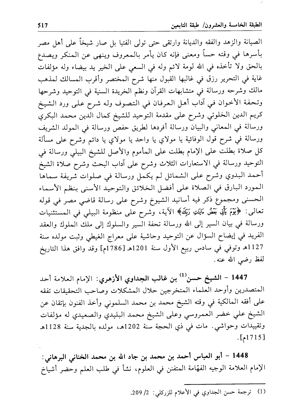 1447 - الشيخ حسن بن غالب الجداوي الأزهري: الإمام العلامة أحد المتصدرين وأوحد العلماء المتخرجين حلال المشكلات وصاحب التحقيقات تفقه على أفقه المالكية في وقته الشيخ محمد بن محمد السلموني وأخذ الفنون بإتقان عن الشيخ علي خضر العمروسي وعلى الشيخ محمد البليدي والصعيدي له مؤلفات وتقييدات وحواشي. مات في ذي الحجة سنة 1202 هـ، مولده بالجدية سنة 1128 هـ[1715 م].