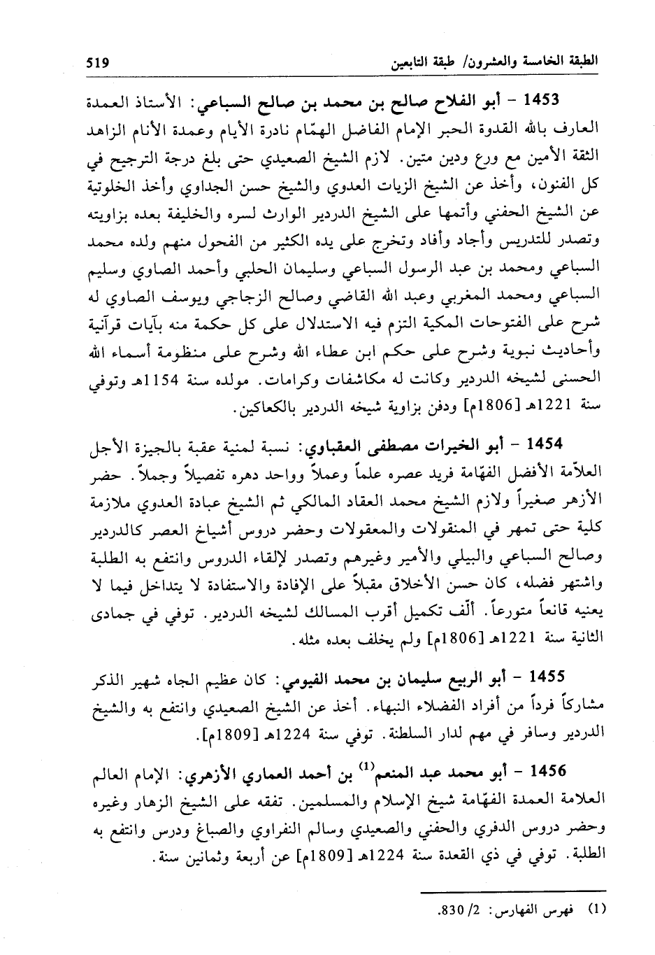 1453 - أبو الفلاح صالح بن محمد بن صالح السباعي: الأستاذ العمدة العارف بالله القدوة الحبر الإمام الفاضل الهمّام نادرة الأيام وعمدة الأنام الزاهد الثقة الأمين مع ورع ودين متين. لازم الشيخ الصعيدي حتى بلغ درجة الترجيح في كل الفنون، وأخذ عن الشيخ الزيات العدوي والشيخ حسن الجداوي وأخذ الخلوتية عن الشيخ الحفني وأتمها على الشيخ الدردير الوارث لسره والخليفة بعده بزاويته وتصدر للتدريس وأجاد وأفاد وتخرج على يده الكثير من الفحول منهم ولده محمد السباعي ومحمد بن عبد الرسول السباعي وسليمان الحلبي وأحمد الصاوي وسليم السباعي ومحمد المغربي وعبد الله القاضي وصالح الزجاجي ويوسف الصاوي له شرح على الفتوحات المكية التزم فيه الاستدلال على كل حكمة منه بآيات قرآنية وأحاديث نبوية وشرح على حكم ابن عطاء الله وشرح على منظومة أسماء الله الحسنى لشيخه الدردير وكانت له مكاشفات وكرامات. مولده سنة 1154 هـ وتوفي سنة 1221 هـ[1806 م] ودفن بزاوية شيخه الدردير بالكعاكين.