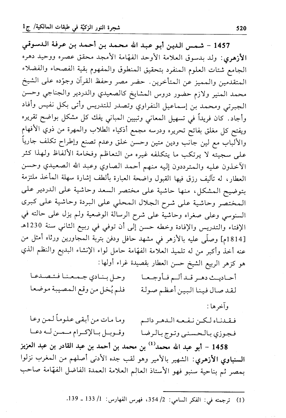 1457 - شمس الدين أبو عبد الله محمد بن أحمد بن عرفة الدسوقي الأزهري: ولد بدسوق العلامة الأوحد الفهّامة الأمجد محقق عصره ووحيد دهره الجامع شتات العلوم المنفرد بتحقيق المنطوق والمفهوم بقية الفصحاء والفضلاء المتقدمين والمميز عن المتأخرين. حضر مصر وحفظ القرآن وجوّده على الشيخ محمد المنير ولازم حضور دروس المشايخ كالصعيدي والدردير والجناجي وحسن الجبرتي ومحمد بن إسماعيل النفراوي وتصدر للتدريس وأتى بكل نفيس وأفاد وأجاد. كان فريداً في تسهيل المعاني وتبيين المباني يفك كل مشكل بواضح تقريره ويفتح كل مغلق بفاتح تحريره ودرسه مجمع أذكياء الطلاب والمهرة من ذوي الأفهام والألباب مع لين جانب ودين متين وحسن خلق وعدم تصنع وإطراح تكلف جارياً على سجيته لا يرتكب ما يتكلفه غيره من التعاظم وفخامة الألفاظ ولهذا كثر الآخذون عليه والمترددون إليه منهم أحمد الصاوي وعبد الله الصعيدي وحسن العطار، له تآليف رزق فيها القبول واضحة العبارة بألطف إشارة سهلة المأخذ ملتزمة بتوضيح المشكل، منها حاشية على مختصر السعد وحاشية على الدردير على المختصر وحاشية على شرح الجلال المحلي على البردة وحاشية على كبرى السنوسي وعلى صغراه وحاشية على شرح الرسالة الوضعية ولم يزل على حالته في الإفتاء والتدريس والإفادة وخطه حسن إلى أن توفي في ربيع الثاني سنة 1230 هـ[1814 م] وصلّى عليه بالأزهر في مشهد حافل ودفن بتربة المجاورين ورثاه أمثل من عنه أخذ وأكبر من له تلميذ العلامة الفهّامة حامل لواء الإنشاء البديع والنظم الذي هو كزهر الربيع الشيخ حسن العطار بقصيدة غراء أولها: