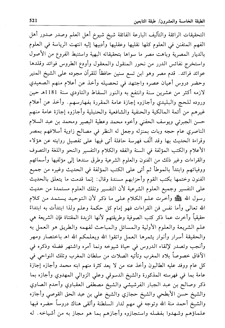 التحقيقات الرائقة والتآليف البارعة الفائقة شيخ شيوخ أهل العلم وصدر صدور أهل اللهم المتفنن في العلوم كلها نقليها وعقليها وأدبيها إليه انتهت الرياسة في العلوم بالديار المصرية وباهت مصر ما سواها بتحقيقاته البهية واستنبط الفروع من الأصول واستخرج نفائس الدرر من نحور المنقول والمعقول وأودع الطروس فوائد وقلدها عوائد فرائد. قدم مصر وهو ابن تسع سنين حافظاً للقرآن مجوده على الشيخ المنير وحضر دروس أعيان عصره واجتهد في تحصيله وأخذ عن أعلام منهم الصعيدي لازمه أكثر من عشرين سنة وانتفع به والنور السقاط والتاودي سنة 1181 هـ حين وروده للحج والبليدي وأجازوه إجازة عامة المقررة بفهارسهم. وأخذ عن أعلام غيرهم من أئمة المالكية والحنفية والشافعية والحنبلية وأجازوه إجازة عامة منهم حسن الجبرتي ويوسف الحفني وأخوه محمد وعطية البصير ومحمد بن عبد السلام الناصري عام حجه وبات بمنزله وجعل له النظر في مصالح زاوية أسلافهم بمصر وقراءة الحديث بها وقد ألّف فهرسة حافلة أتى فيها على تفصيل روايته عن هؤلاء الأعلام والكتب المؤلفة في السنة والفقه والكلام والتفسير والنحو واللغة والتصوف والقراءات وغير ذلك من الفنون والعلوم الشرعية وطرق سندها إلى مؤلفيها وأسمائهم ووفياتهم وابتدأ بالموطأ ثم أتى على الكتب المؤلفة في الحديث وغيره من جميع الفنون وختمها بكتب القوم وأحزابهم مسندة وقال: إنما قدمت ما يتعلق بالحديث على التفسير وجميع العلوم الشرعية لأن التفسير وتلك العلوم مستمدة من حديث رسول الله - صلى الله عليه وسلم - وأخرت علم الكلام على ما ذكر لأن التوحيد يستمد من كلام الله تعالى وأما نفس فن القراءات فهو إمام كل حكمة وعلم ولذا ابتدأت به ابتداءً حقيقياً وأخرت عما ذكر كتب الصوفية وطريقتهم لأنها الزبدة المقتناة فإن الشريعة هي علم الشريعة والعلوم الأولية والمسائل والمباحث لفهمه والطريق هو العمل به والحقيقة أسرار وأنوار يثمرها العمل واتقوا الله ويعلمكم الله اهـ باختصار ومهر وأنجب وتصدر لإلقاء الدروس في حياة شيوخه ونما أمره واشتهر فضله وذكره في الآفاق خصوصاً بلاد المغرب وتأتيه الصلات من سلطان المغرب وتلك النواحي في كل عام ووفد عليه الطالبون وأخذ عنه من لا يعد كثرة منهم ابنه محمد وأجازه إجازة عامة بما في فهرسته المذكورة والشيخ الدسوقي وعلي الزوالي المهدوي وأجازه بما ذكر وصالح بن عبد الجبار الفرشيشي والشيخ مصطفى العقباوي وأحدم الصاوي والشيخ حسن الأبطحي والشيخ حجازي والشيخ علي بن عبد الحق القوسي وأجازه والشيخ أحمد منة الله وتوجه في مهم لدار السلطنة وألقى هناك دروساً حضره فيها علماؤهم وشهدوا بفضله واستجازوه وأجازهم بما هو مجاز به من أشياخه. له